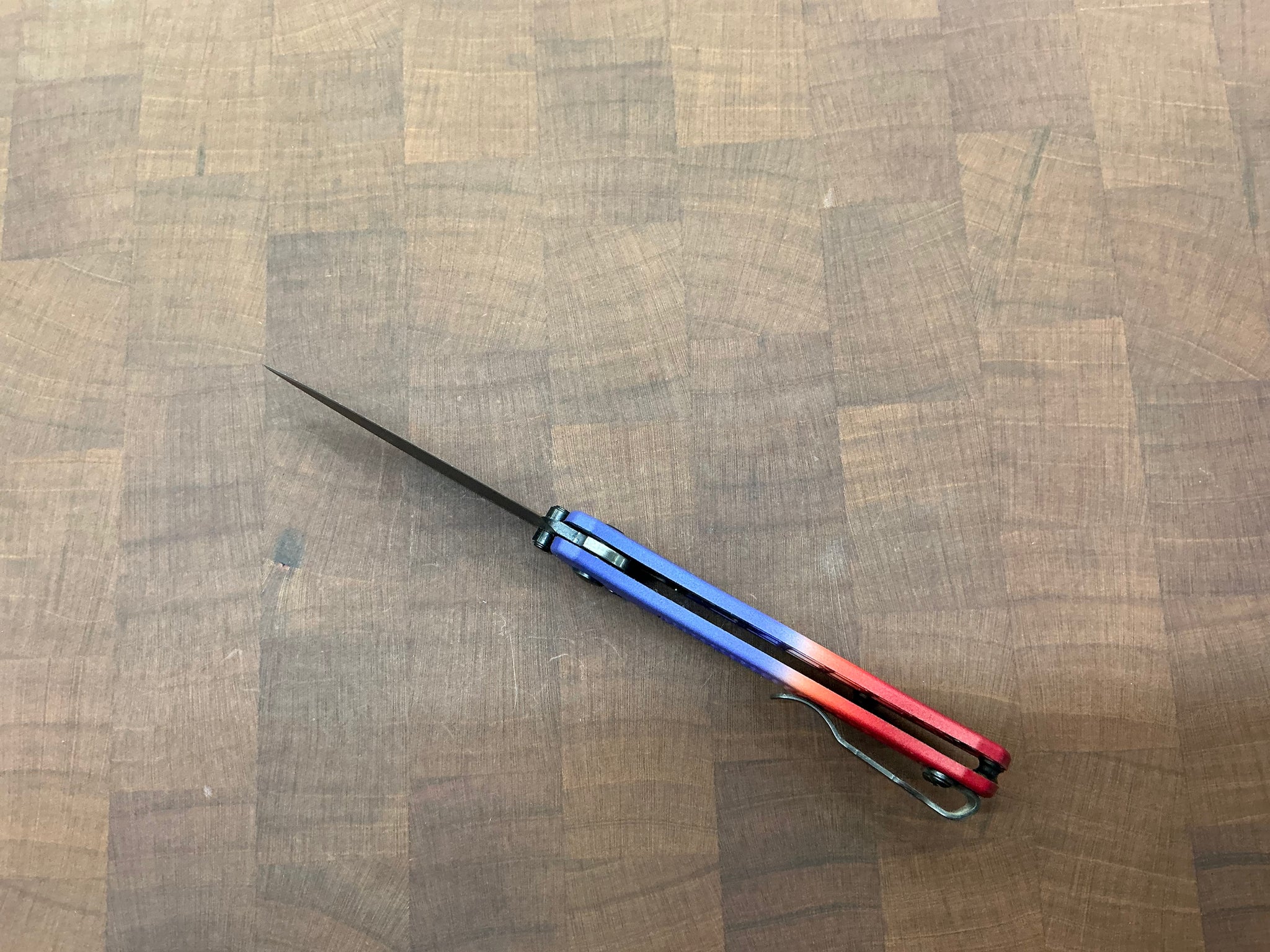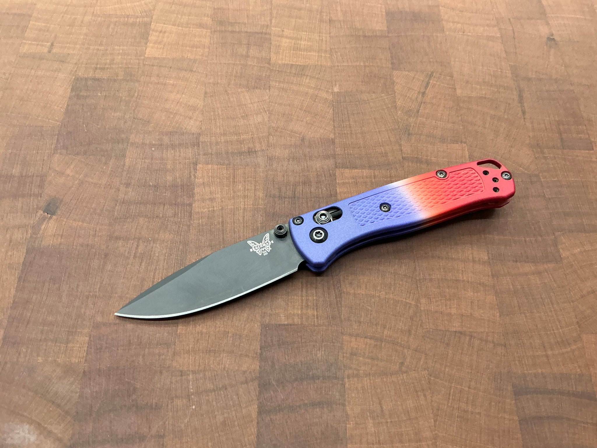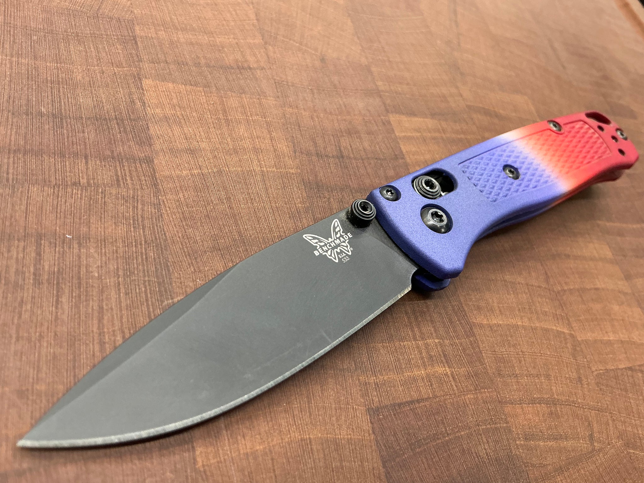 This knife started its life out as a regular 533BK-1, we took it apart and dyed the Grivory Scales with dye, and relube while putting it back together. This one is a beautiful Blue & Red we call The Bomb Pop!
