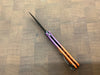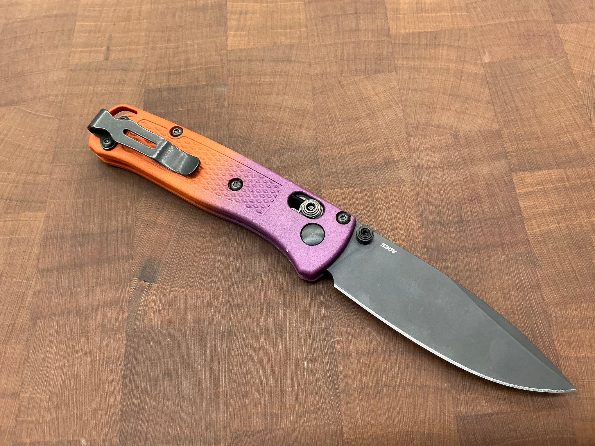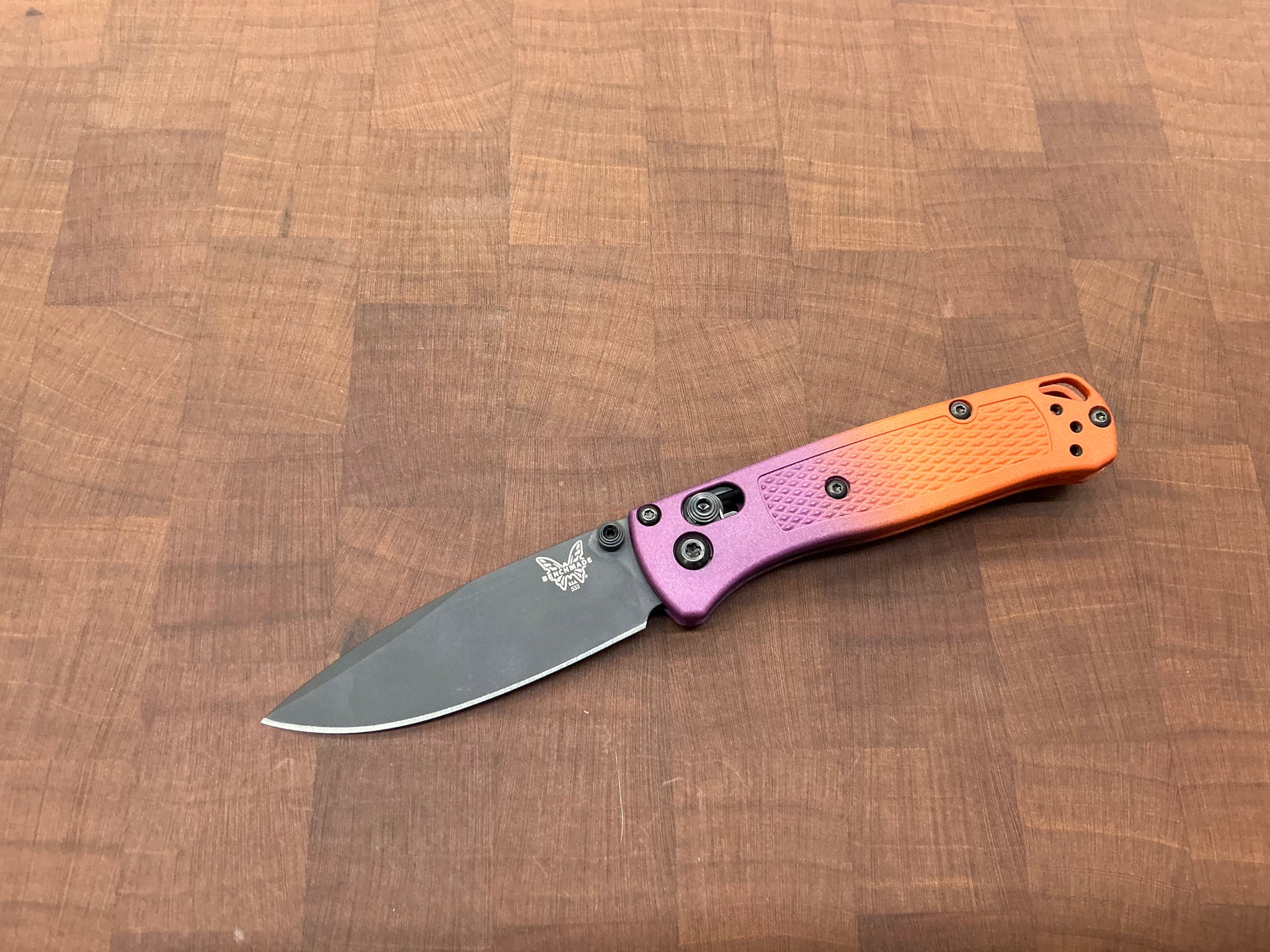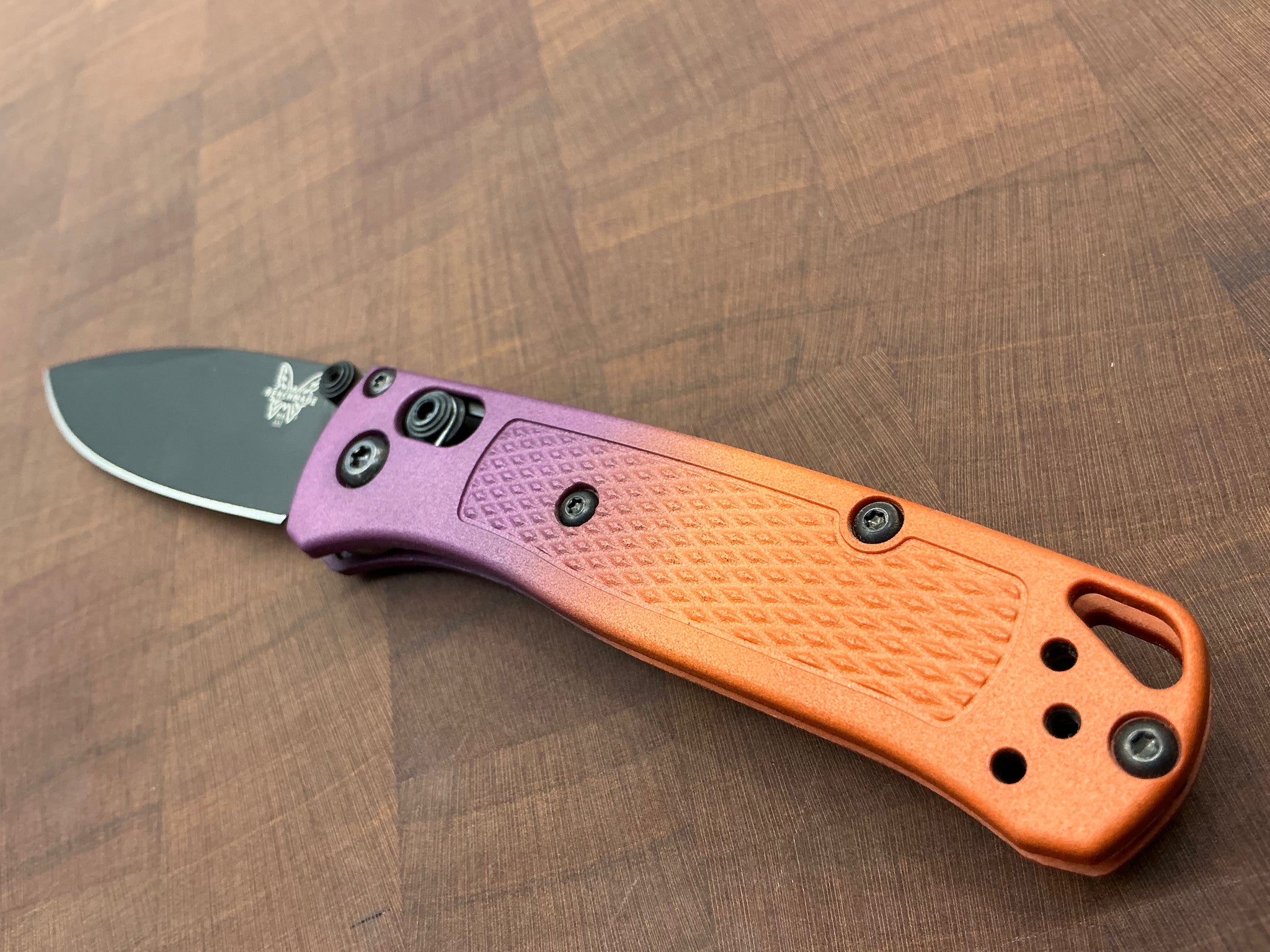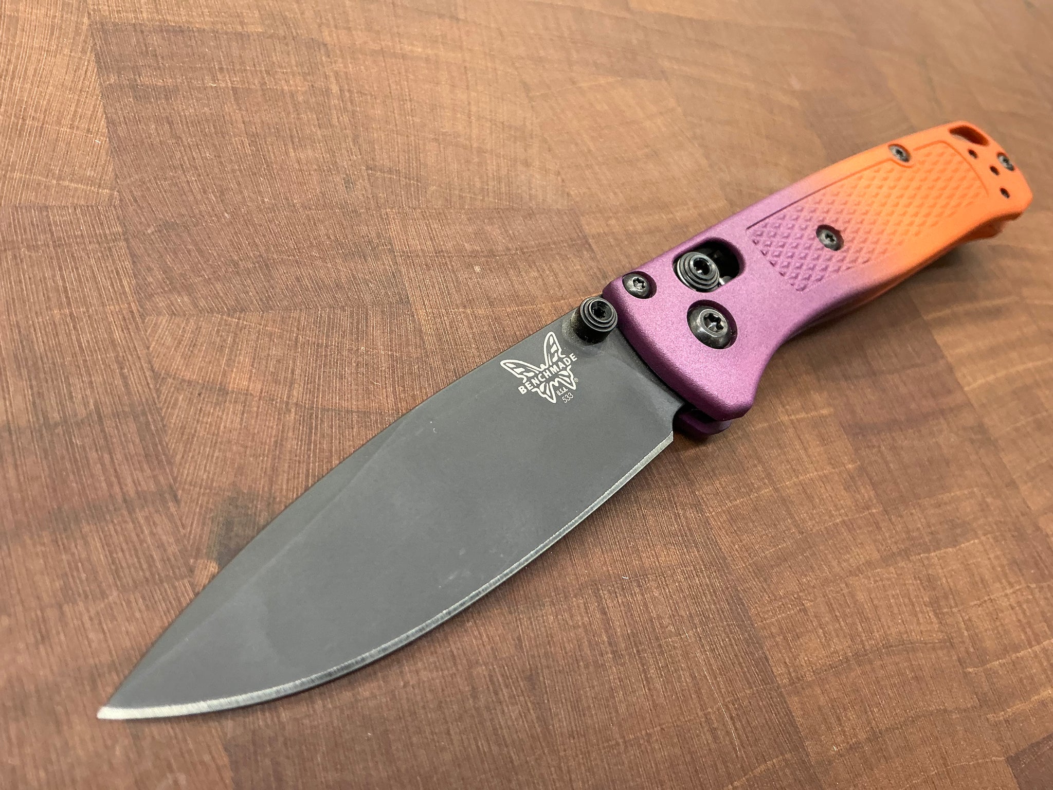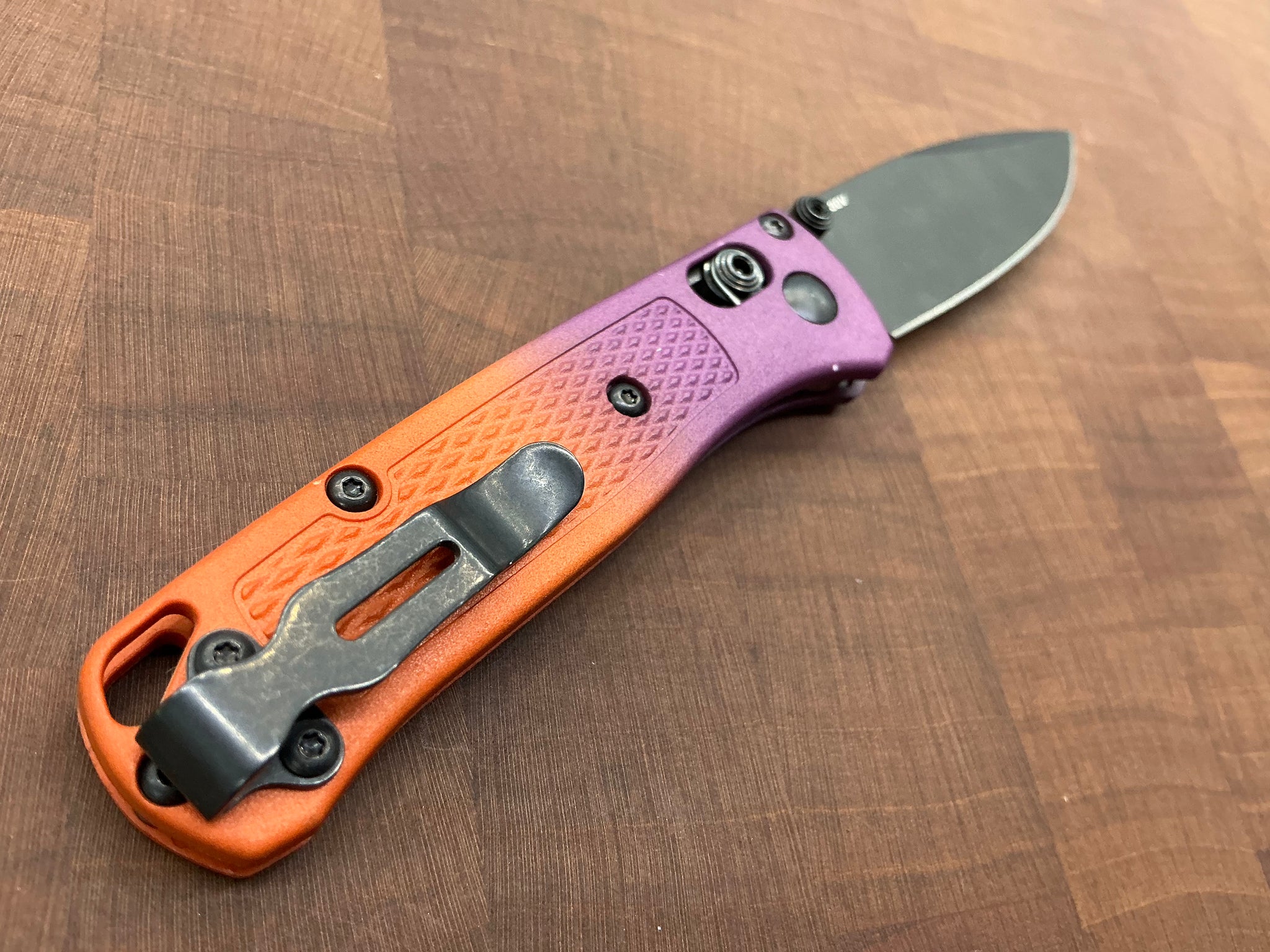 This knife started its life out as a regular 533BK-1, we took it apart and dyed the Grivory Scales with dye, and relube while putting it back together. This one is a beautiful orange and deep purple.