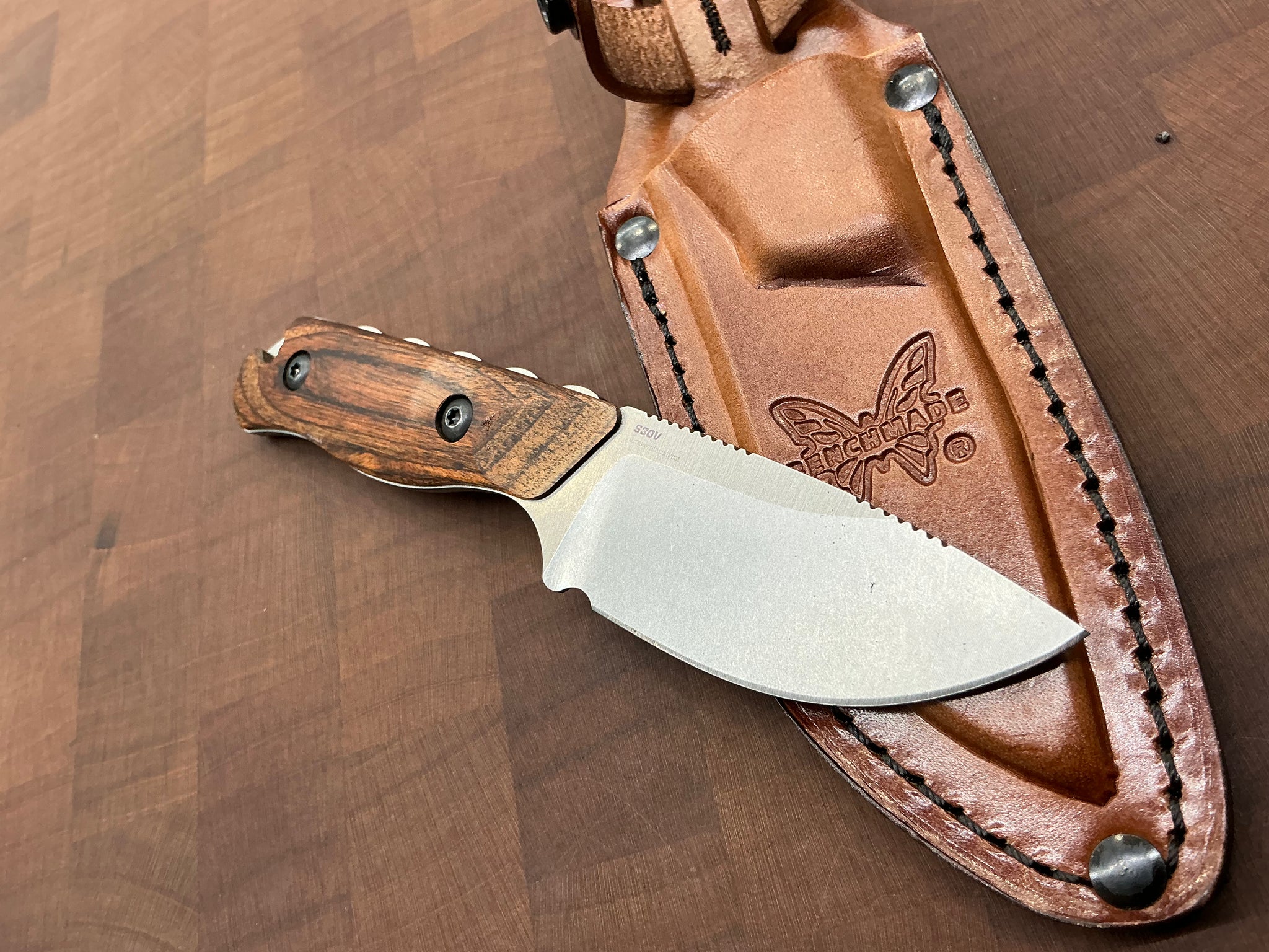 The Hidden Canyon Hunter was a massive hit, and Benchmade upgraded the design with improved ergonomics, added jimping along the spine, and a premium vertical leather sheath with snap retention. The blade is made from CPM-S30V stainless steel, and the handle has stabilized wood scales, that can endure the toughest of elements and still look great.