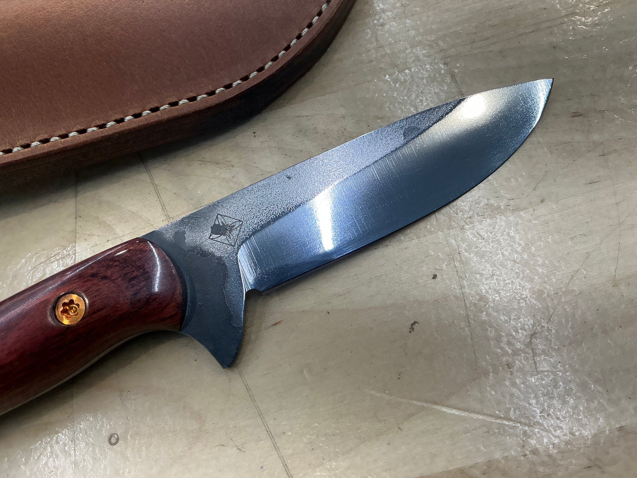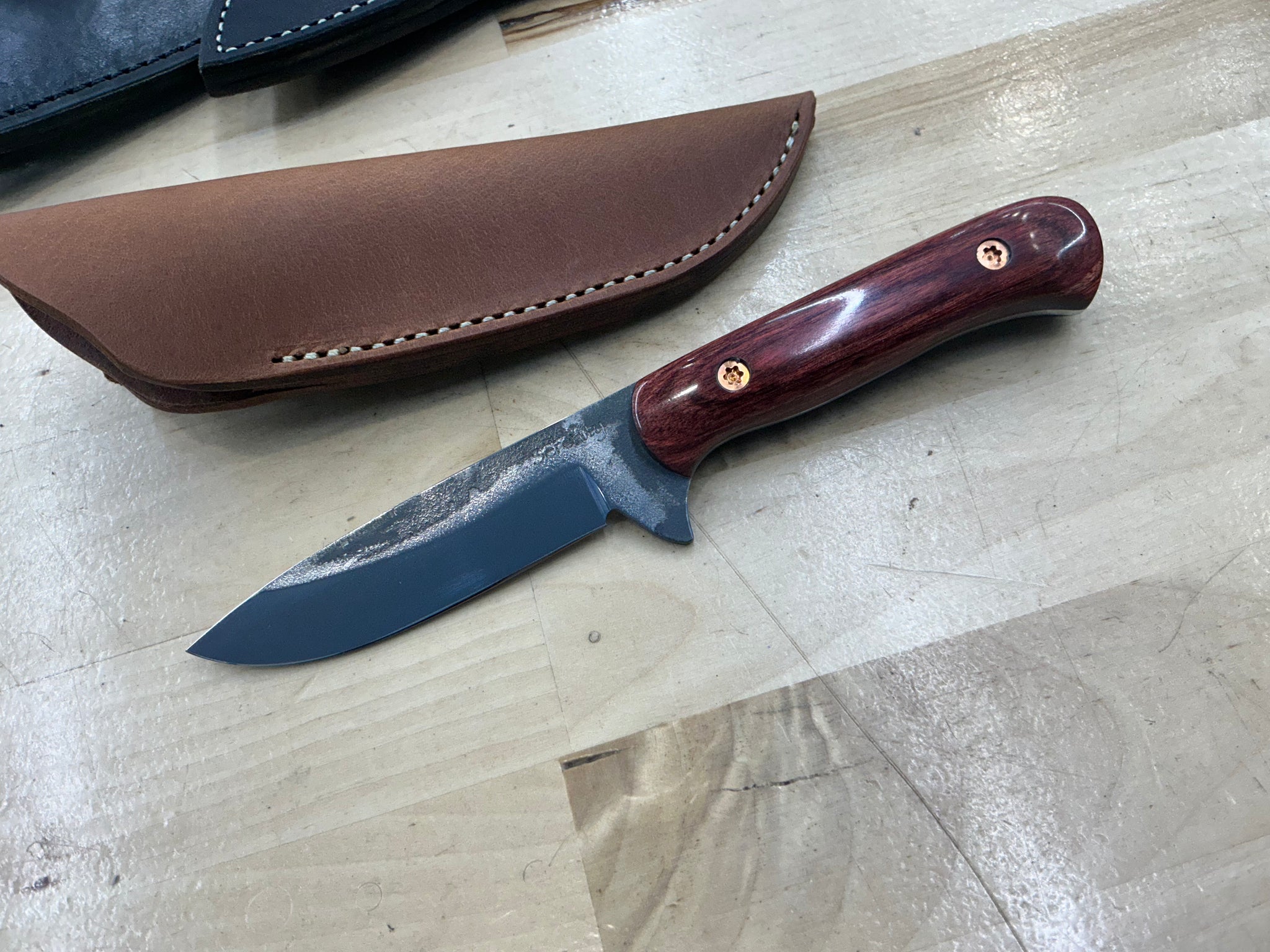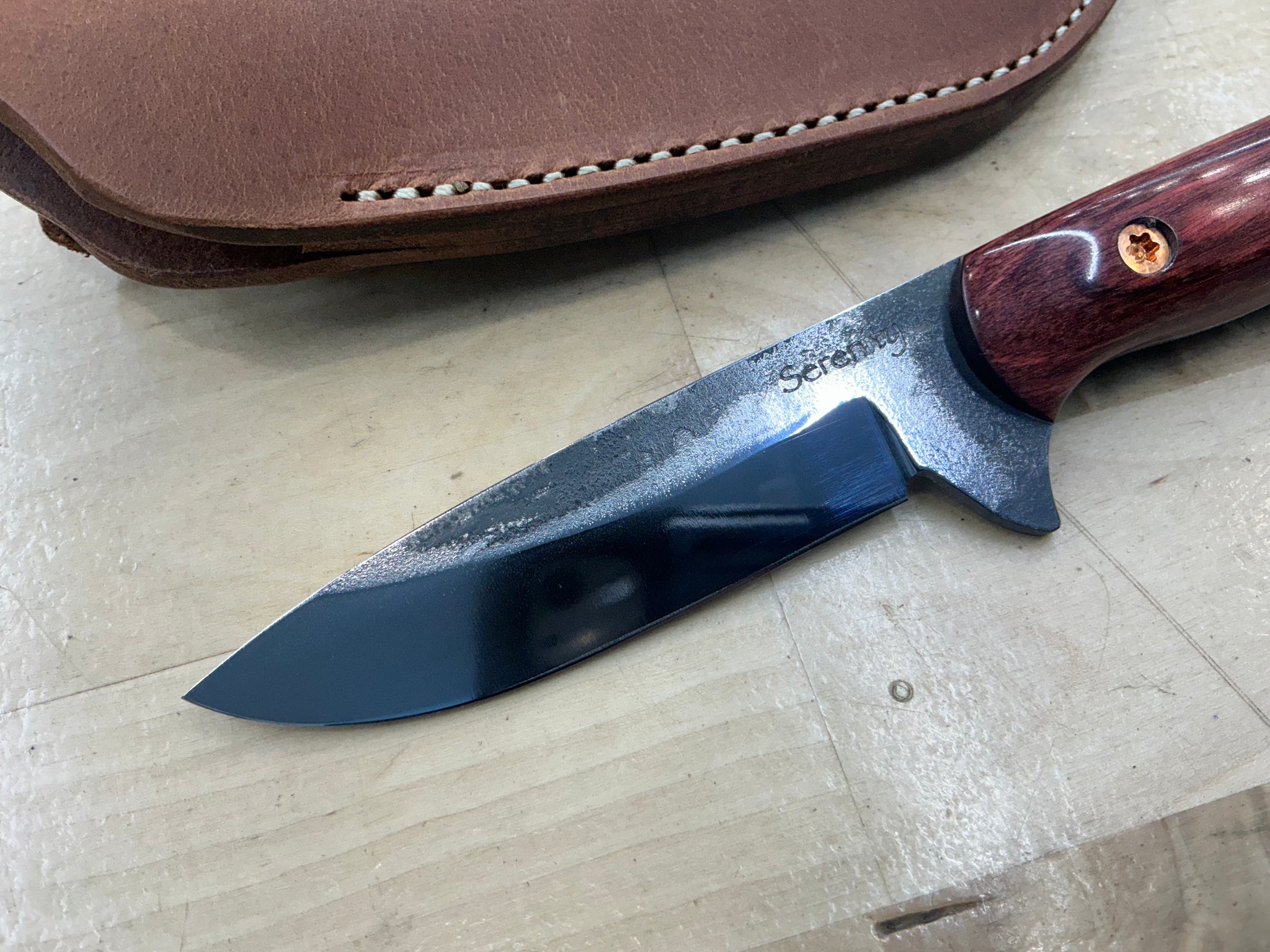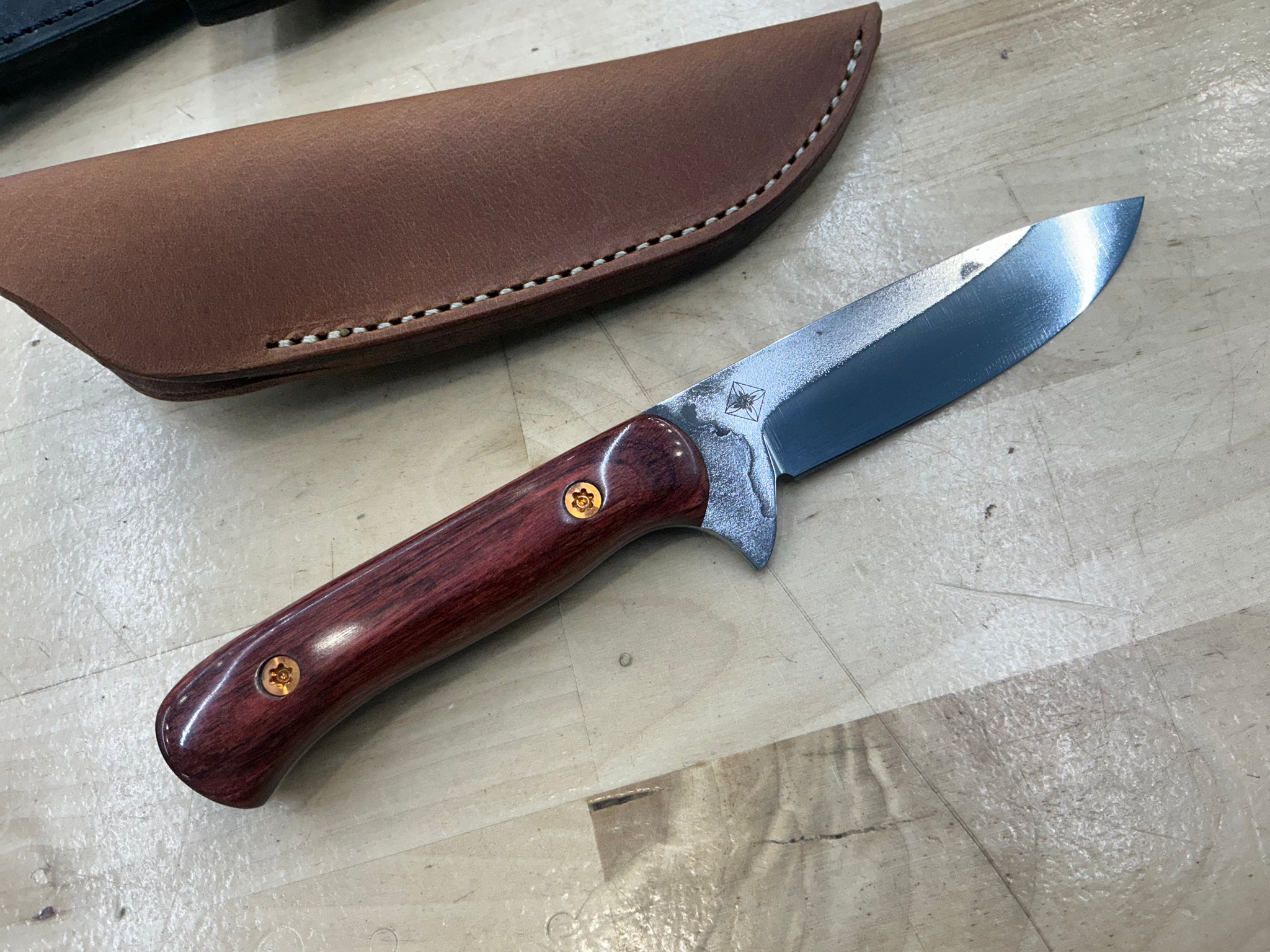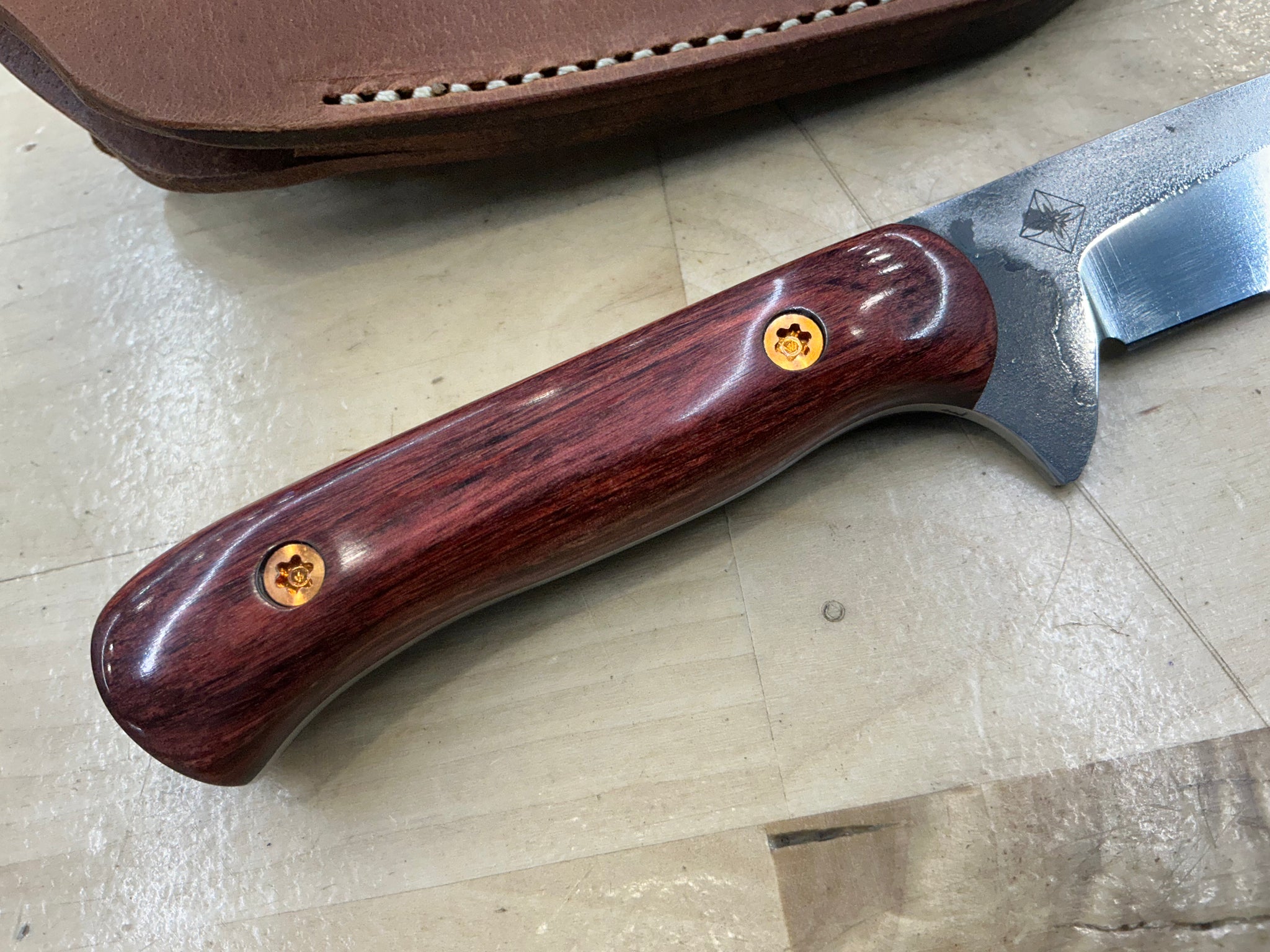 American Utility Knife, featuring CPM 154 for unparalleled strength and a full flat grind for precision. This knife has been designed and refined for over the last 5 years here at Serenity Knives. Take on any adventure with the American Utility Knife! Made with a durable Made in America Cocobolo Laminate wood, this knife is perfect for all your cutting needs. The gulso bolt attachment allows for easy carrying. You get the choice of black or brown sheath. We also have an upgraded paddle sheath with a snap for $25 more. All sheath are locally made by Twisted Arrow Leather Goods.