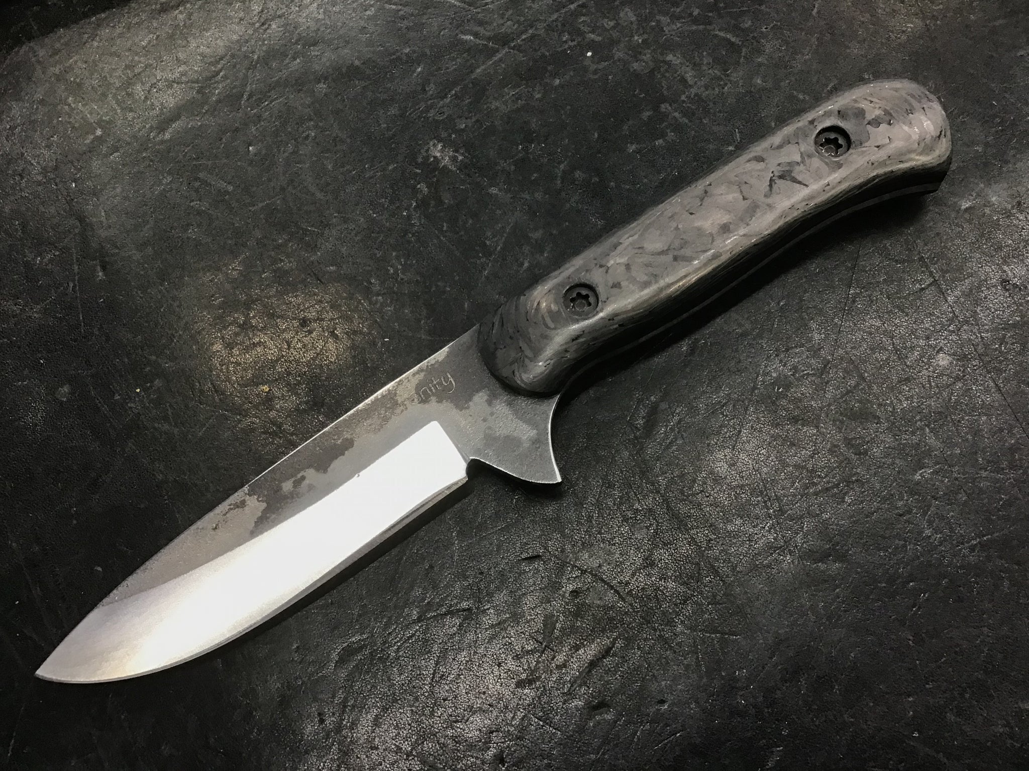 American Utility Knife, featuring CPM 154 for unparalleled strength and a full flat grind for precision. This knife has been designed and refined for over the last 5 years here at Serenity Knives. Take on any adventure with the American Utility Knife! Made with a durable, American made Marbled Carbon Fiber, this knife is perfect for all your cutting needs. The gulso bolt attachment allows for easy carrying, and a black or brown locally handmade sheath for added convenience.