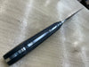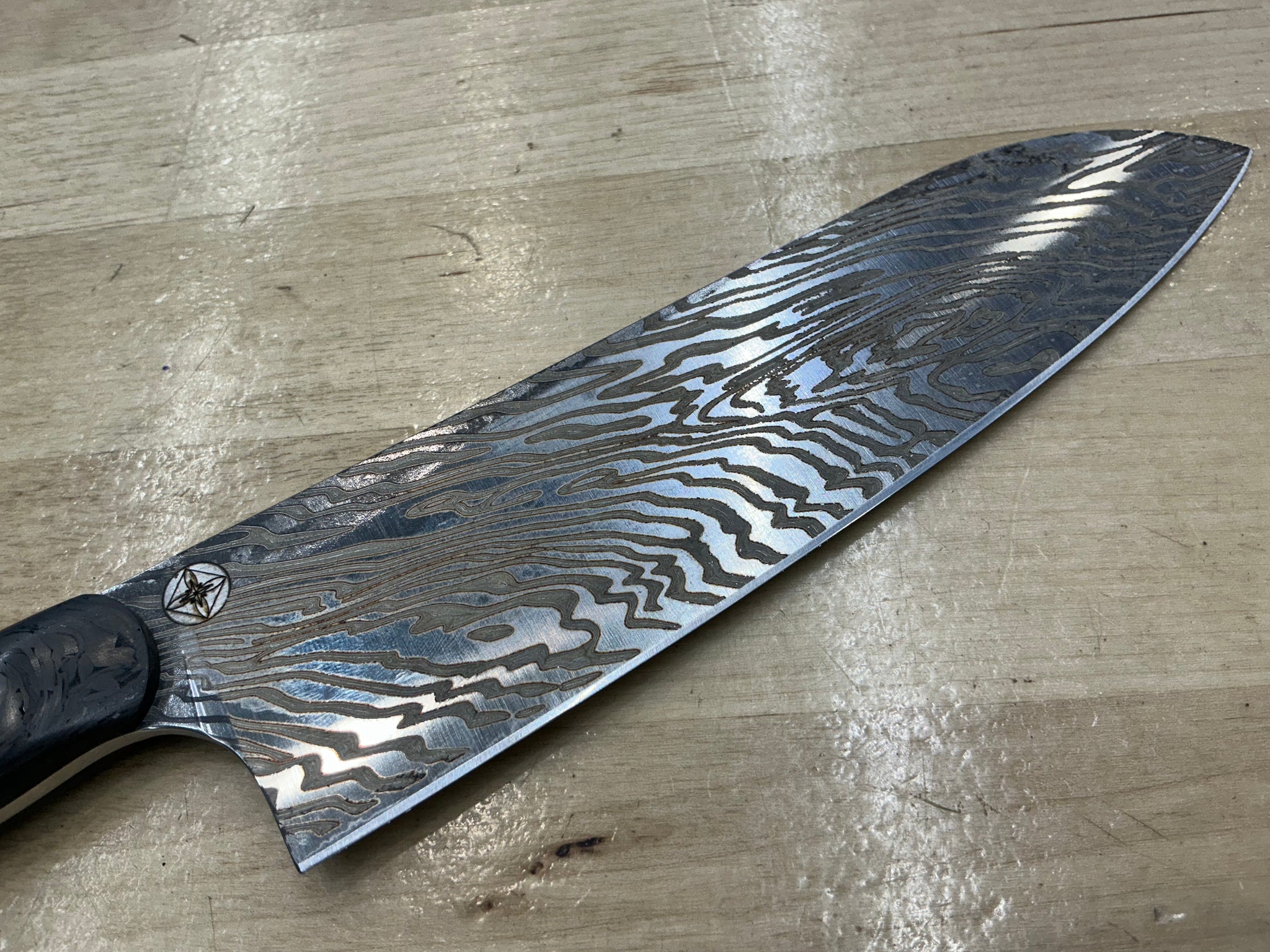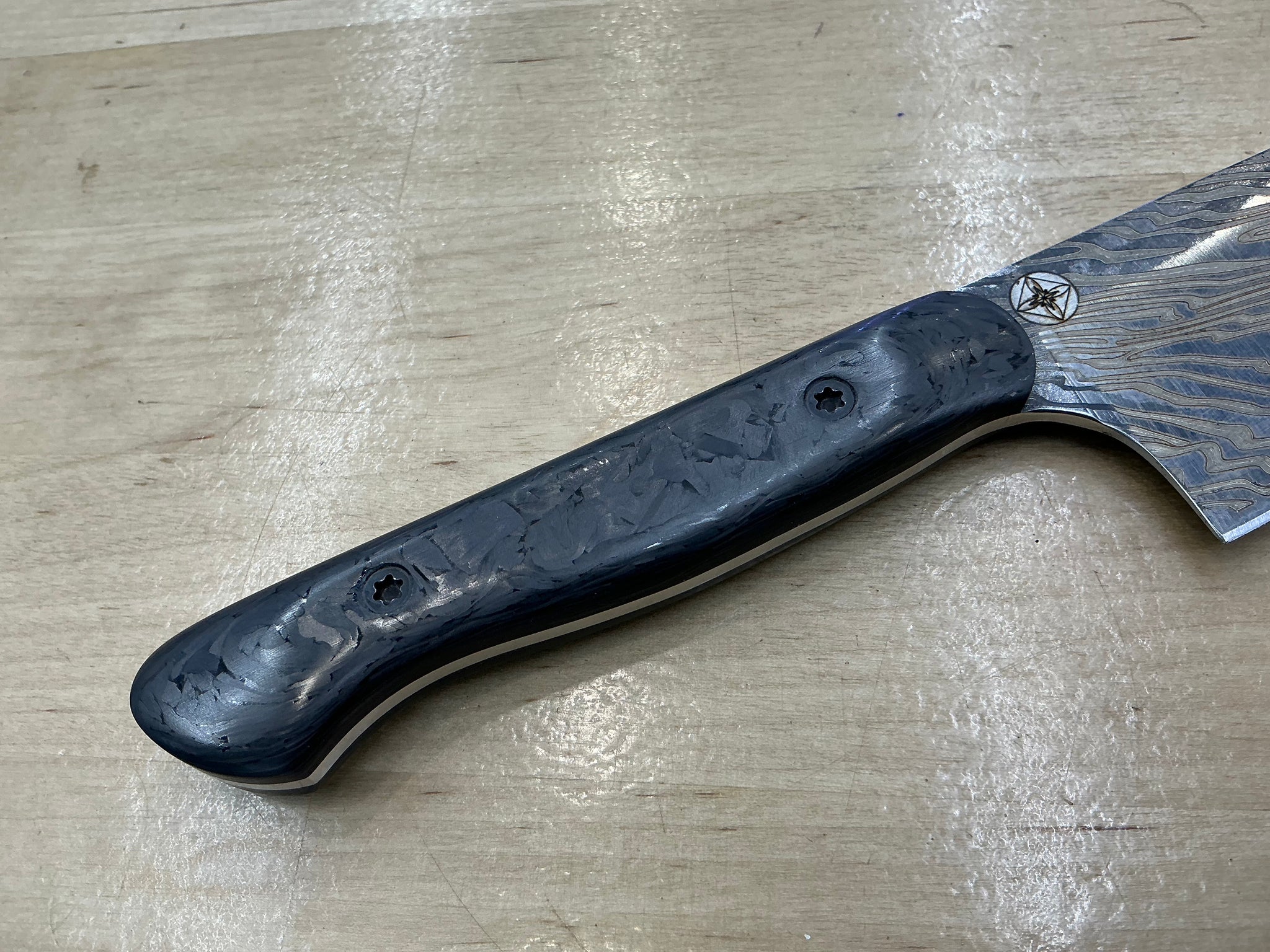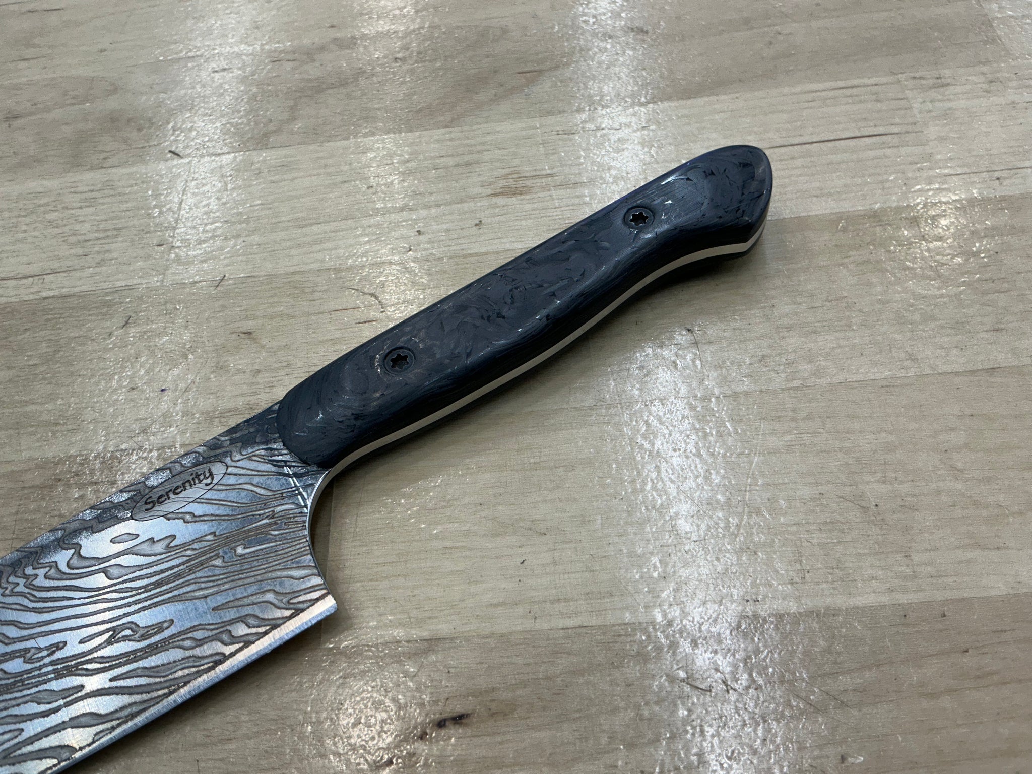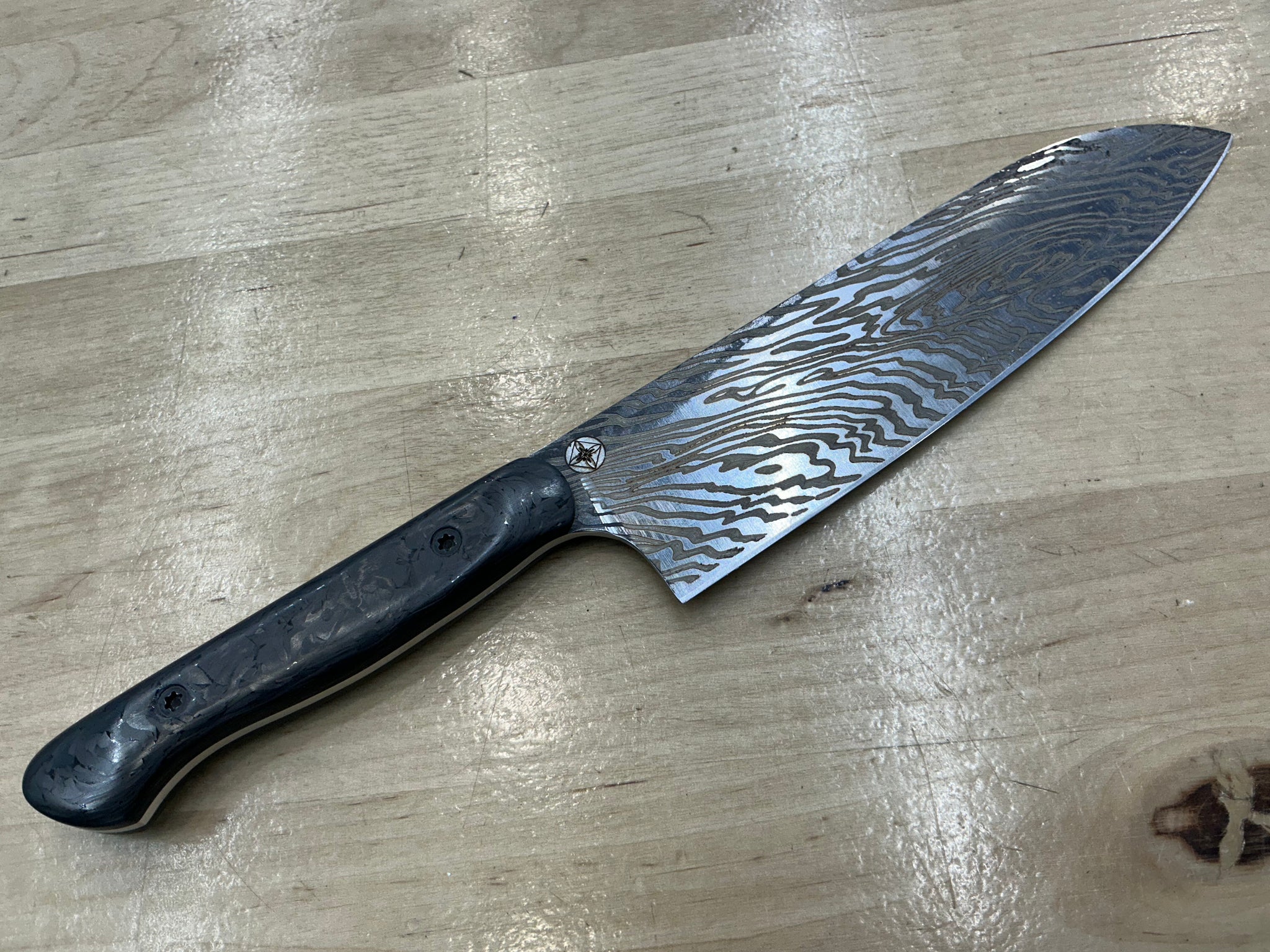 Unleash your boldness with the Carbon Fiber Lazmascus Santoku. CPM154 steel boasts a full flat design and linear shiny finish, with a Damascus Laser Engraving, perfect for tackling any challenge. The Marbled Carbon Fiber Handle adds a touch of adventure to this unique knife. Take on any task with confidence!