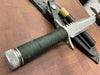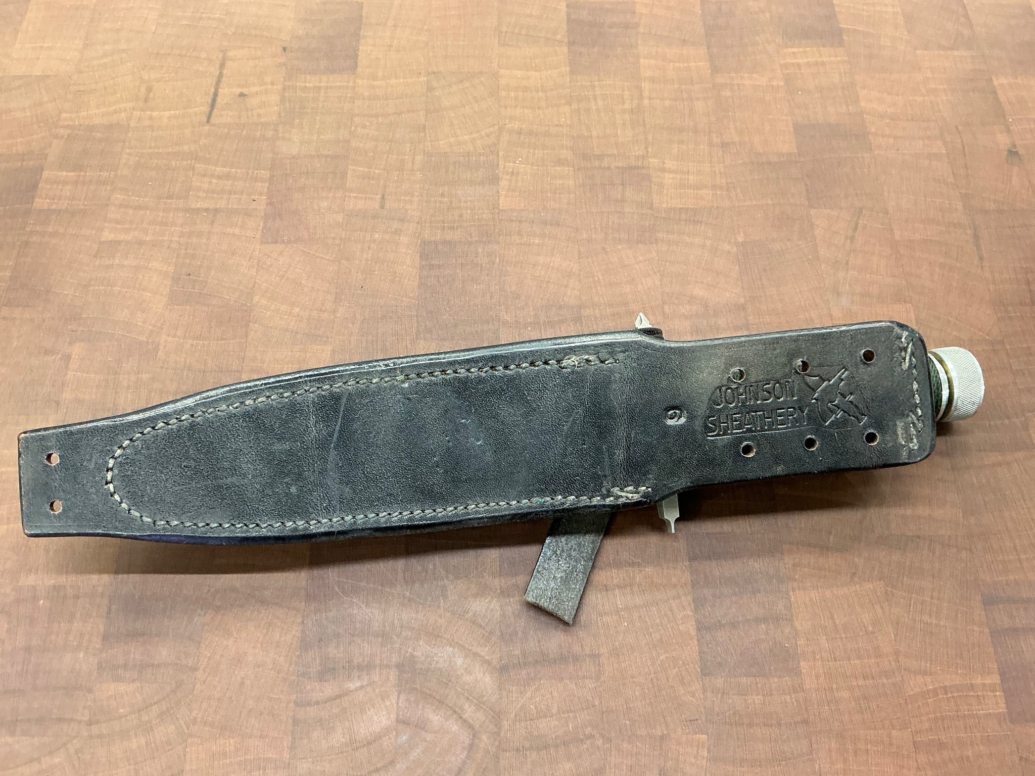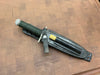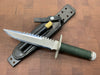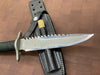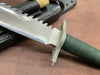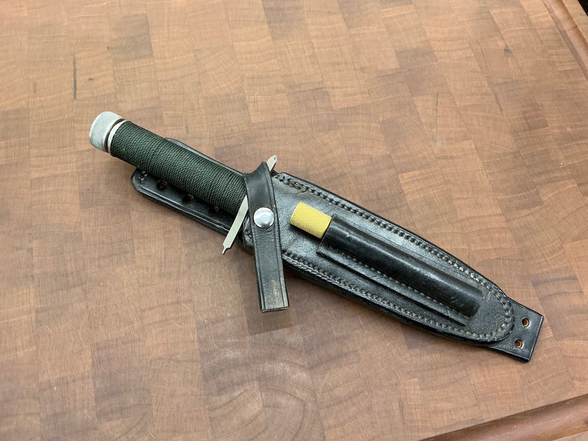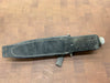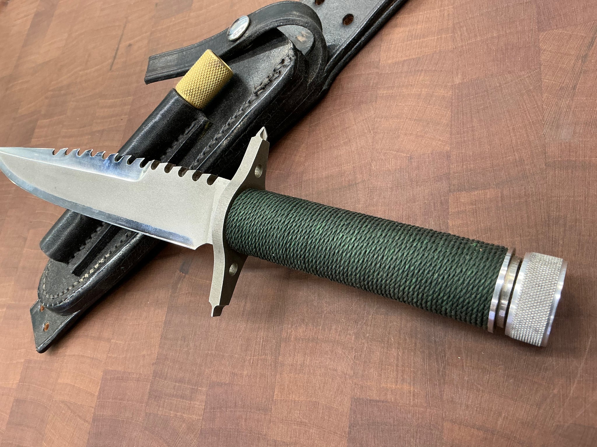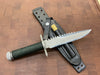 This knife has a 5 1/2” blade with 13 saw teeth, .173" blade thickness and 1.2" blade depth. The stainless steel handle is waterproof, cord wrapped, and hollow. The guard is also a multi-tool with a flat head and Phillips head screw driver. The aluminum butt cap unscrews to allow you to use the hollow handle for storage. Comes with a black leather sheath with sharpening steel made by "Johnson Sheathery".