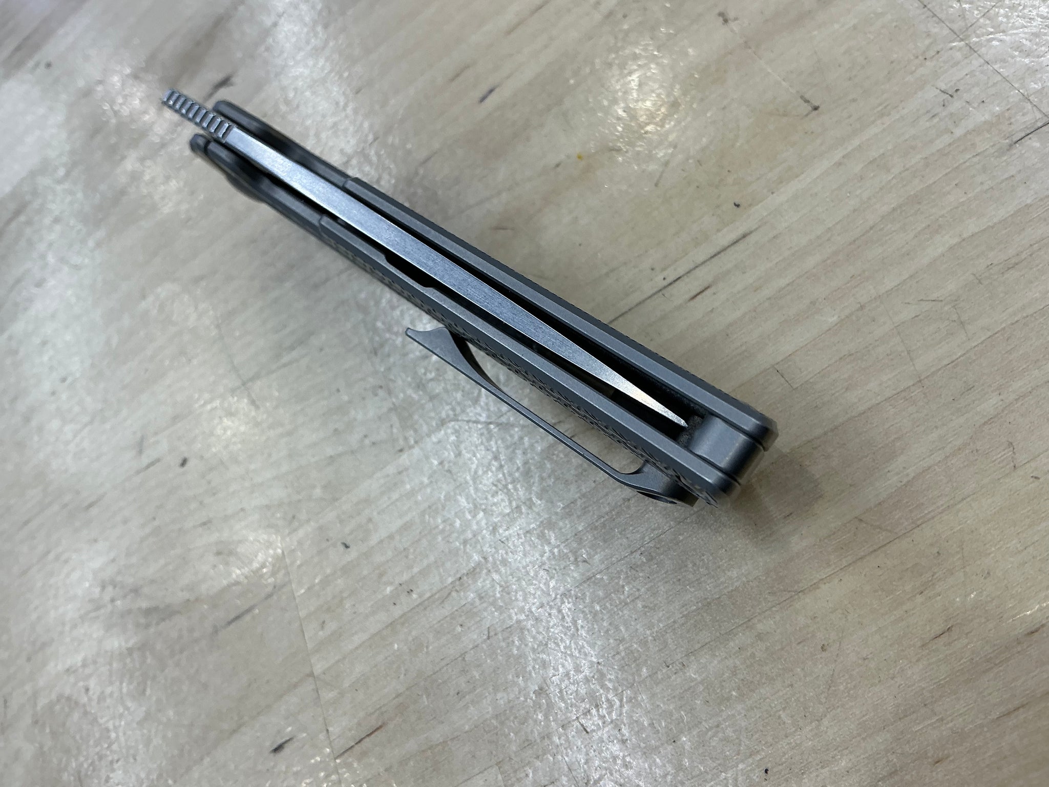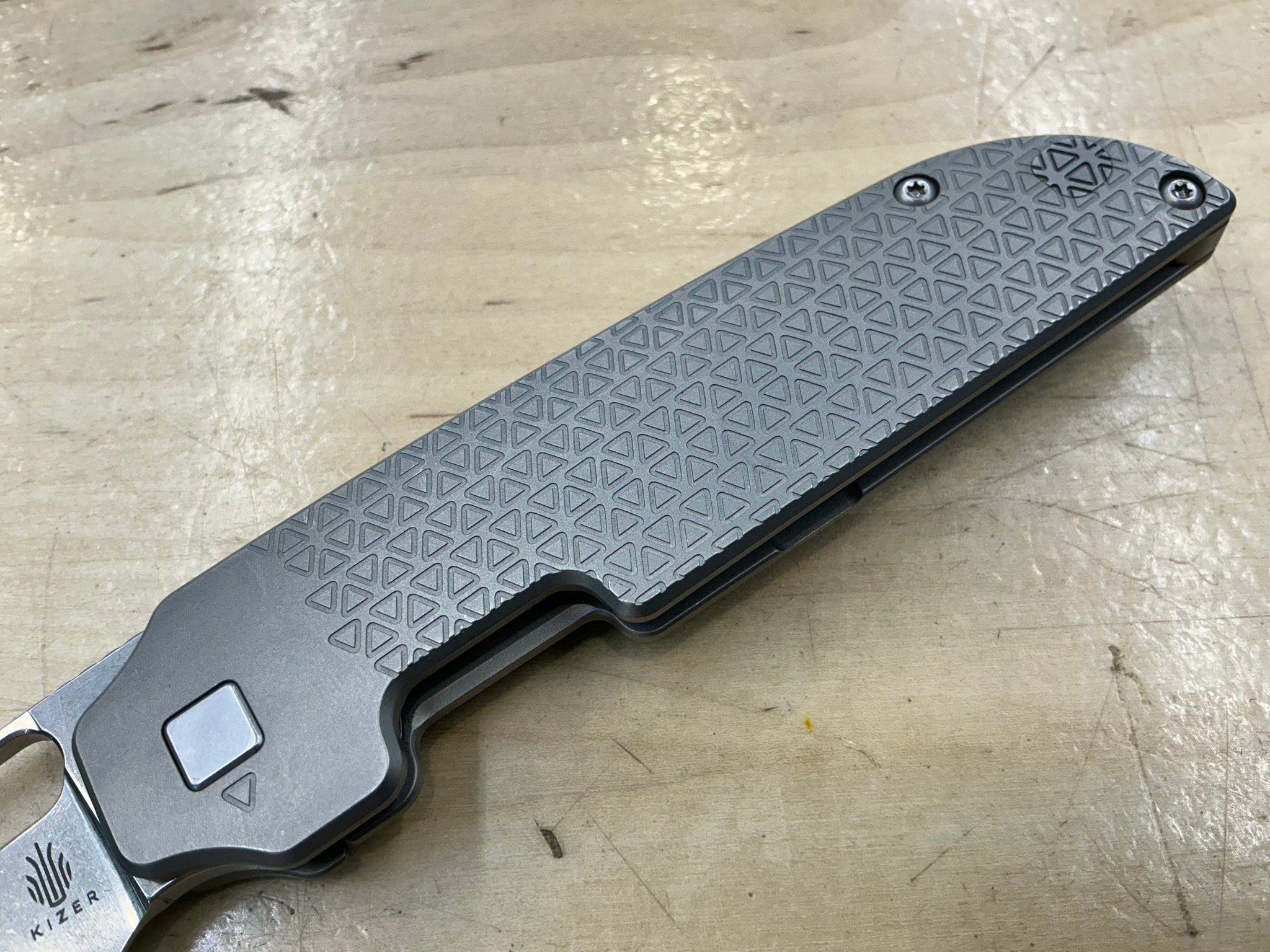 The titanium handle material and frame lock structure make it form an echo cavity. You can not only feel the smooth vibration of the operation, but also hear the pleasant tone. The regular triangular patterns and the square pivot on the handle show the beauty of geometry.