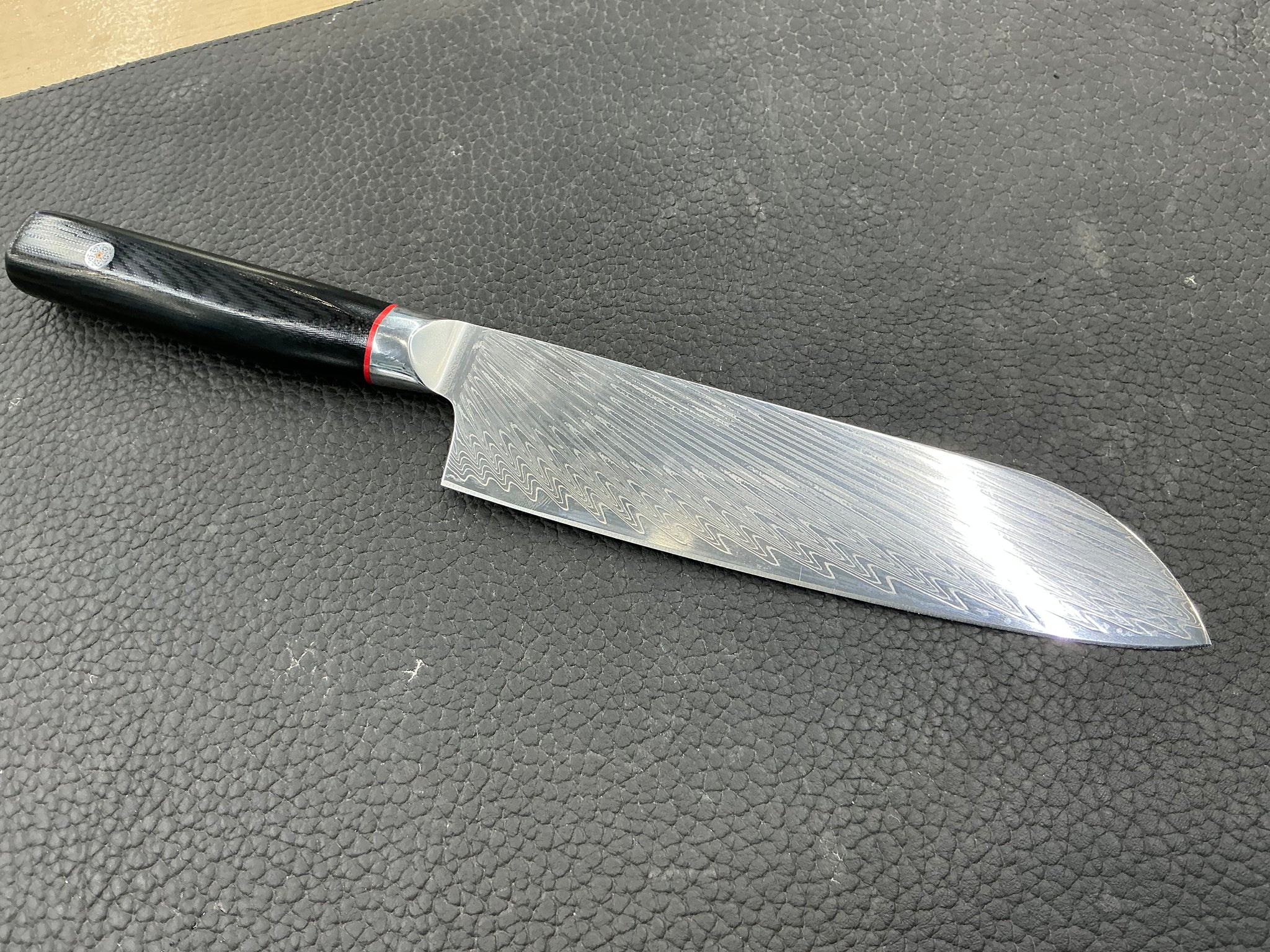 Each blade is forged from Japanese Damascus AUS-10 steel, renowned for its exceptional edge retention and corrosion resistance, elegantly clad in Damascus layers. Paired with a beautifully crafted black g-10 handle that offers a secure, comfortable grip and enhanced durability in the kitchen environment, the Phoenix Santoku delivers precise, reliable cutting performance designed for discerning users who value both form and function.