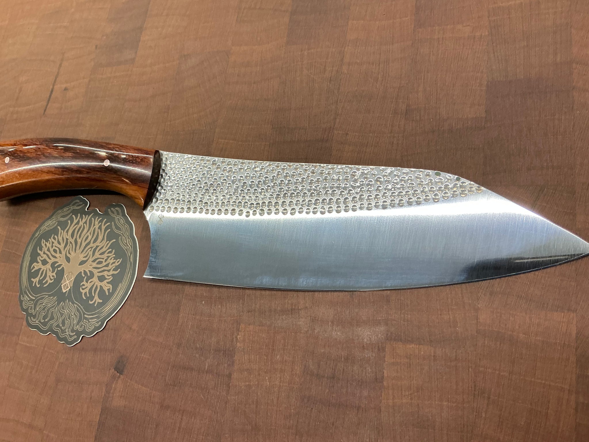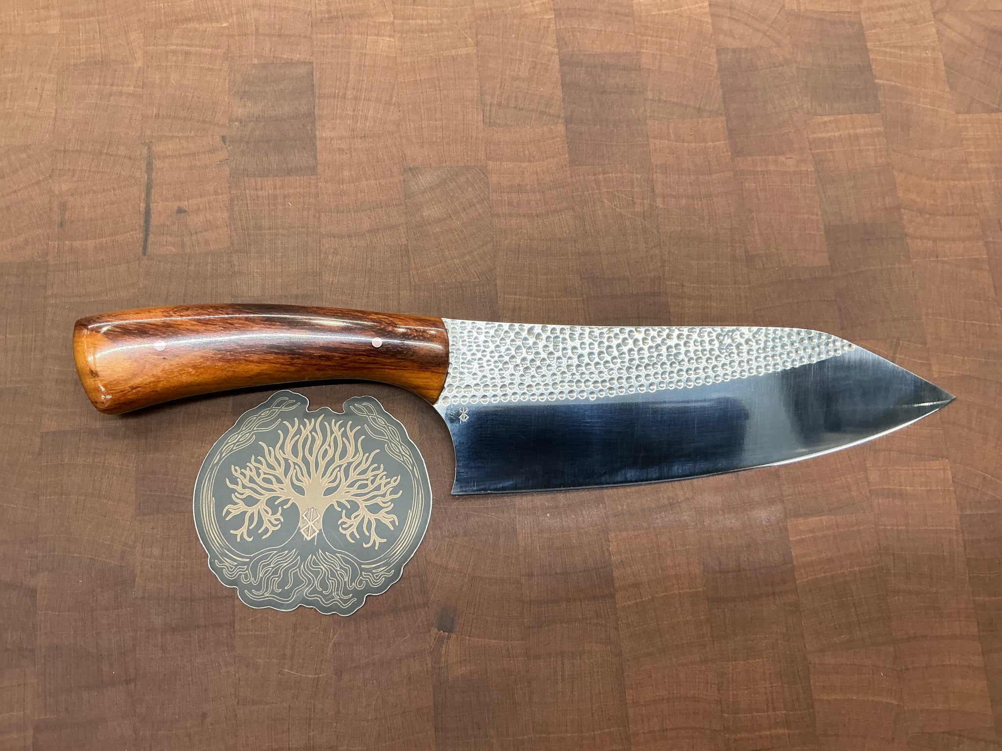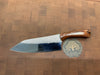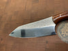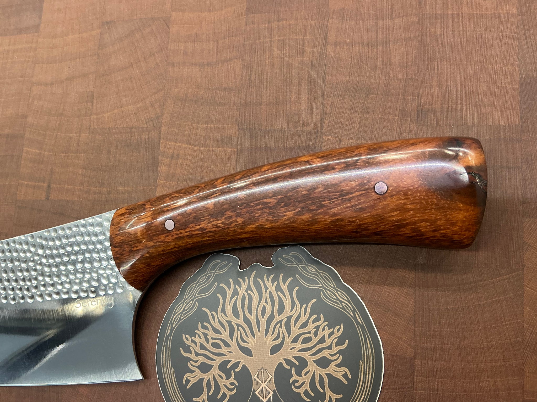 The Snakewood Rocking K-Tip features a Rocking Kiritsuke Gyuto design, crafted from durable CPM 154 steel for enhanced edge retention and corrosion resistance. Its Snakewood handle, complemented by copper pins, provides a secure grip and aesthetic appeal, making it an ideal tool for precision cutting in culinary applications.
