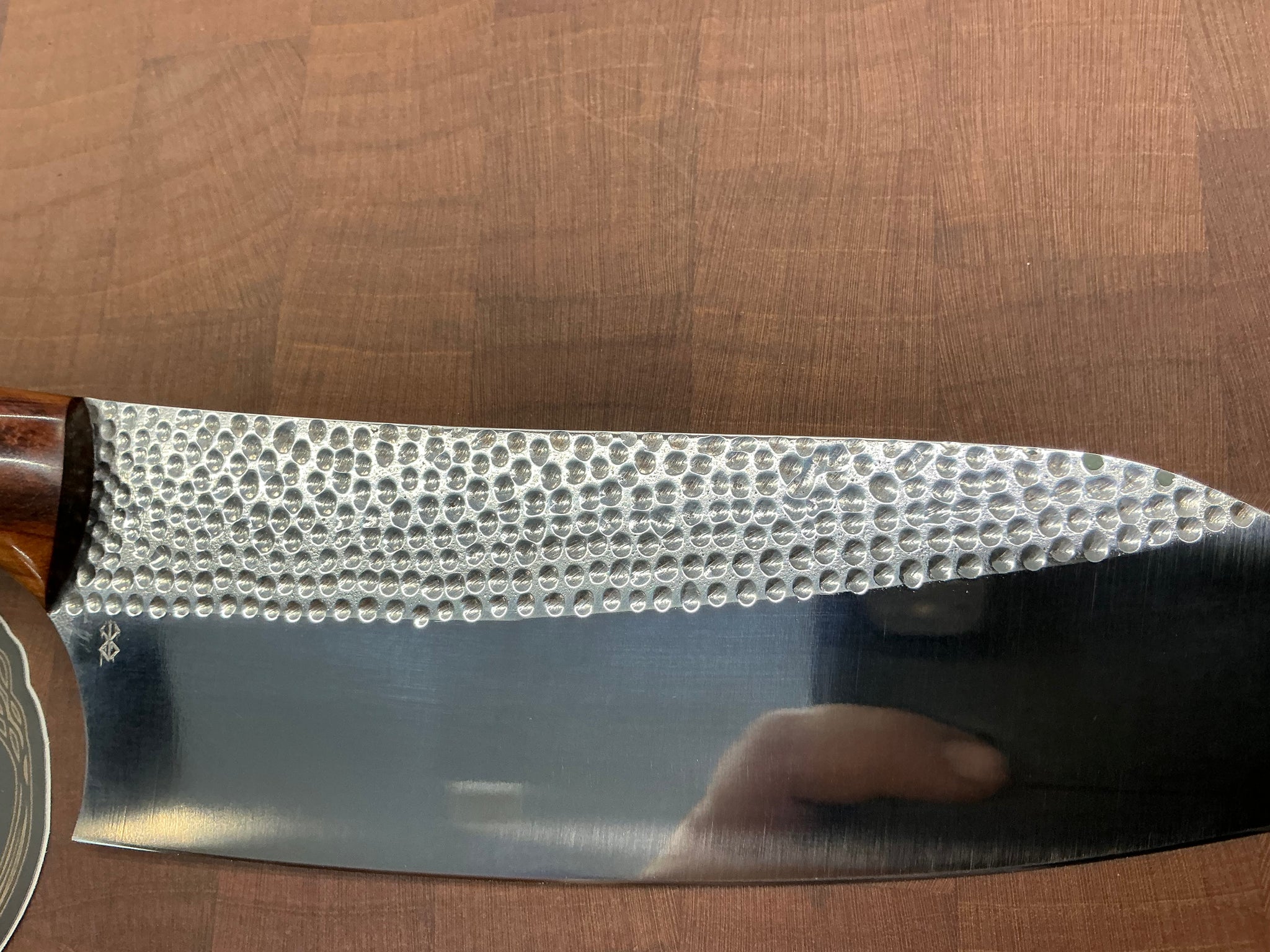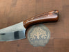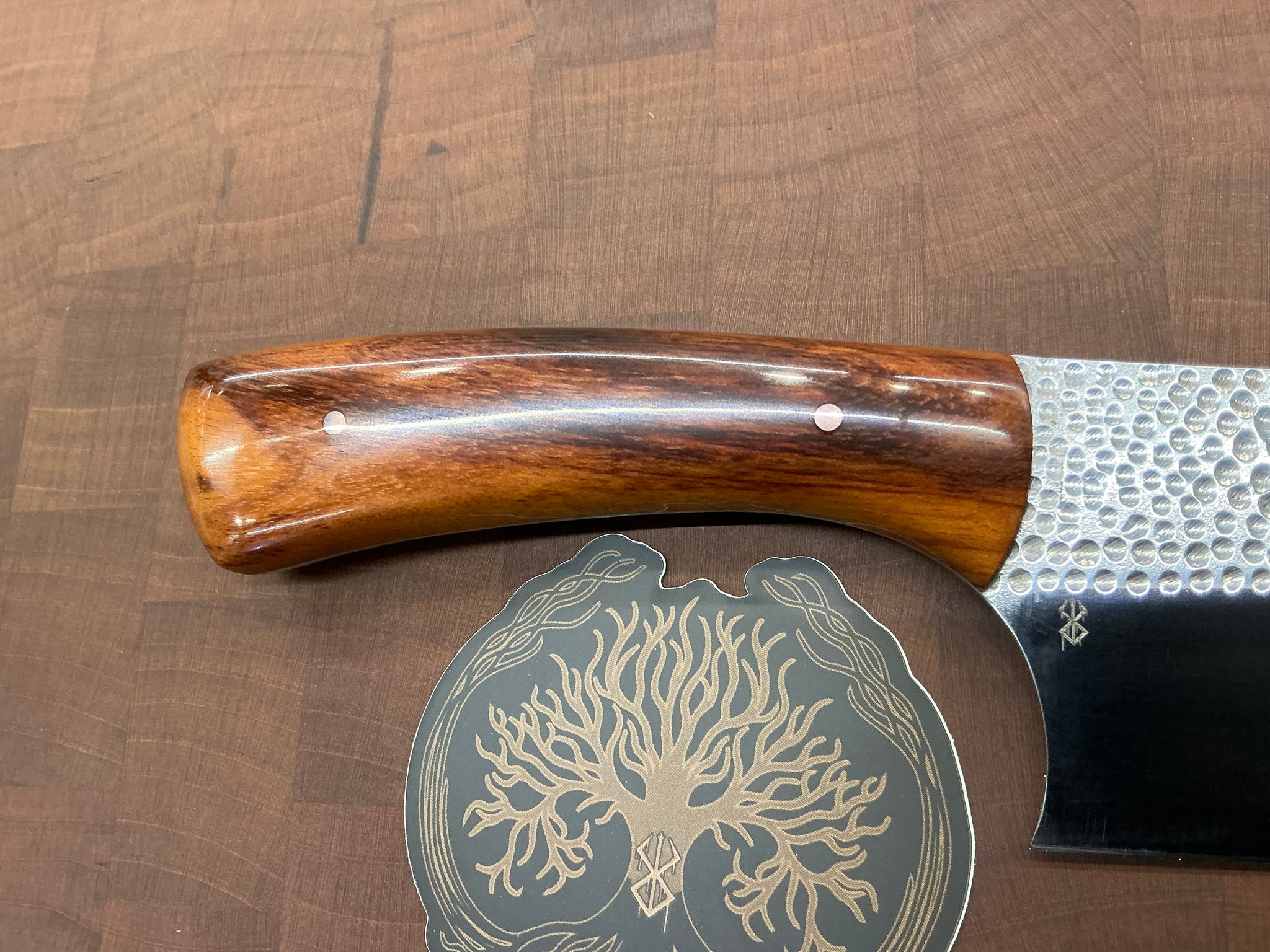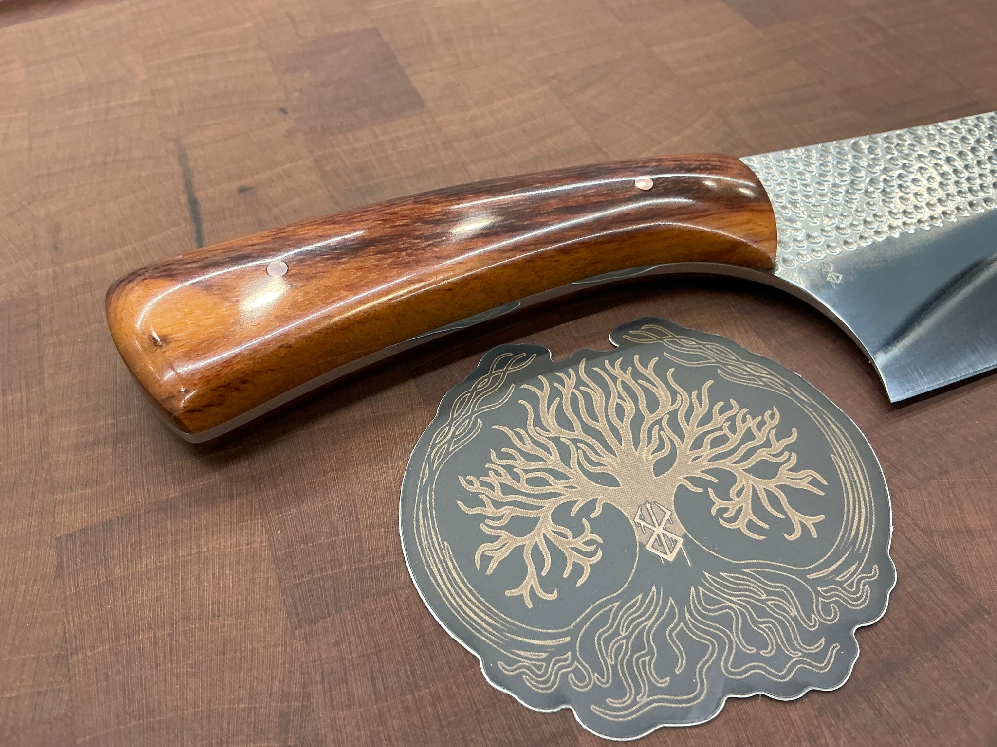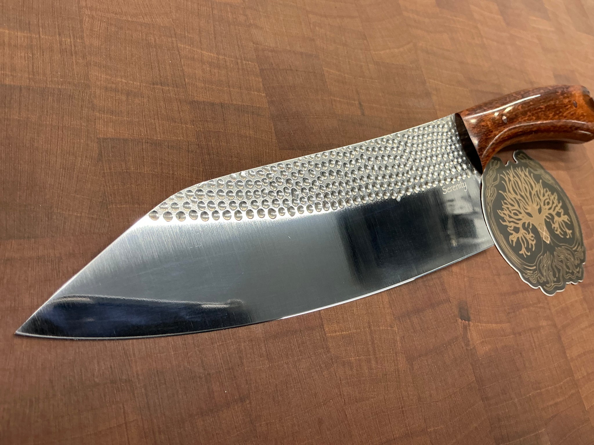The Snakewood Rocking K-Tip features a Rocking Kiritsuke Gyuto design, crafted from durable CPM 154 steel for enhanced edge retention and corrosion resistance. Its Snakewood handle, complemented by copper pins, provides a secure grip and aesthetic appeal, making it an ideal tool for precision cutting in culinary applications.