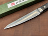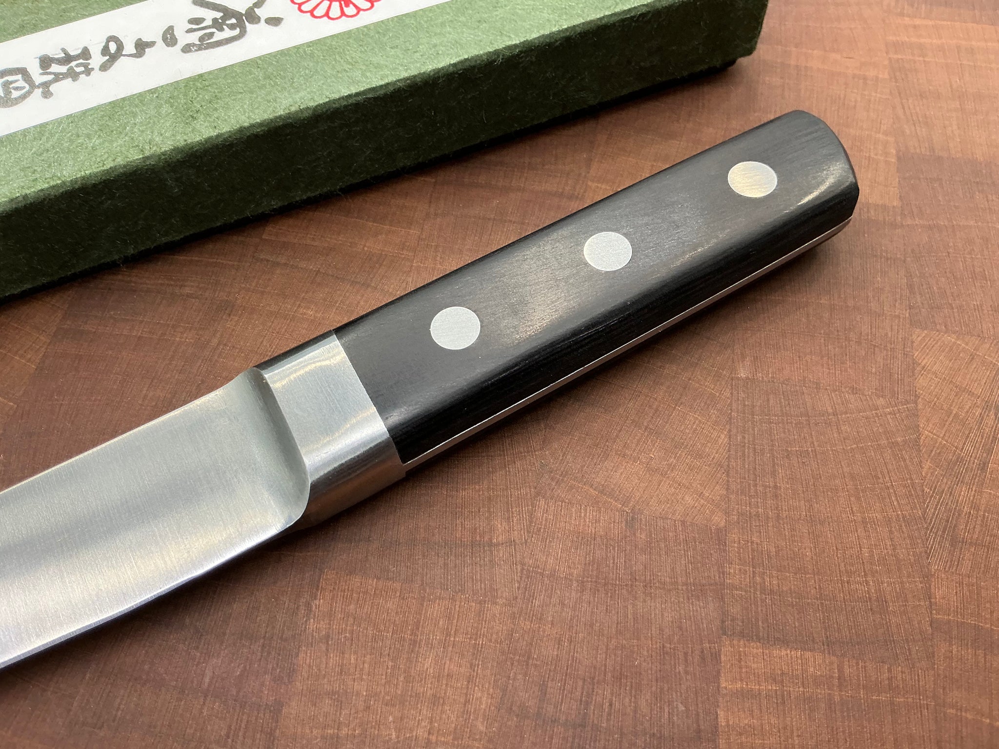 Hankotsu knife blade is made to be sturdy and tough, designed for separating meat from bones. Traditionally, the Hankotsu is used to butcher hanging carcasses, and is held with the blade edge facing downwards in a reverse knife grip. With the durable edge and blade, Hankotsu knife is useful knife and often used for cutting a fish, a chicken.