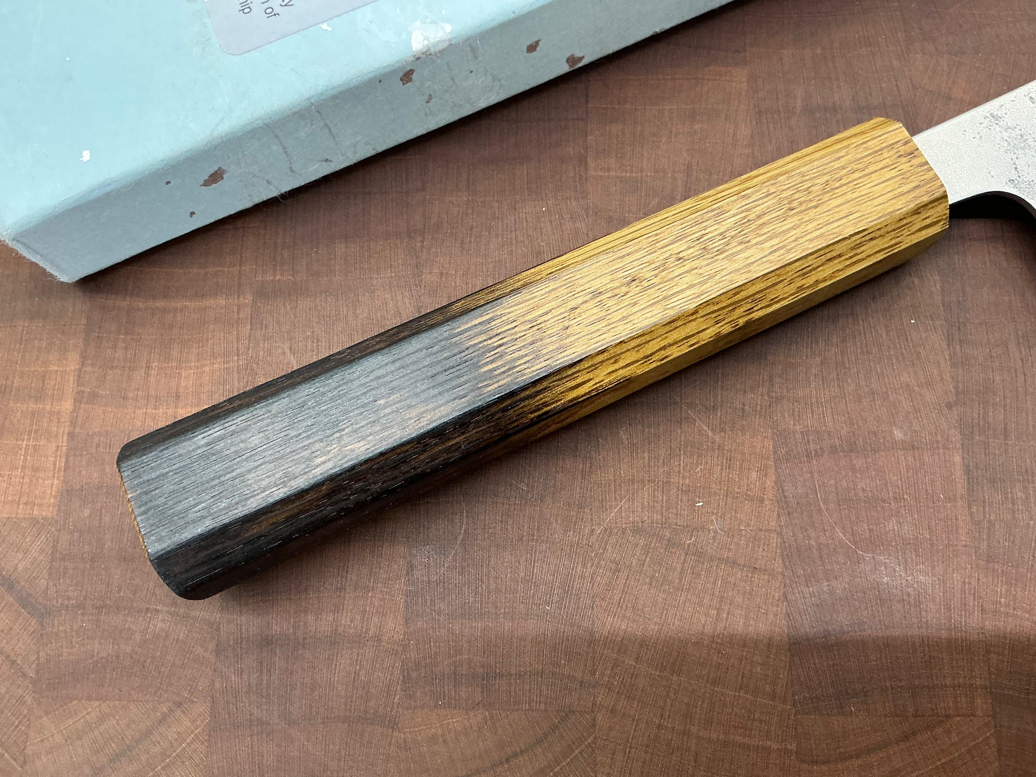 The GN Series is a perfect example of the Japanese design philosophy shibui, a balance of simplicity and complexity. Adorned with a Nashiji (pear skin) finish the 3-layer blade with a Ginsan (silver-3) core is thin, strong, and precise; and the octagonal Oak handle provides a comfortable grip.