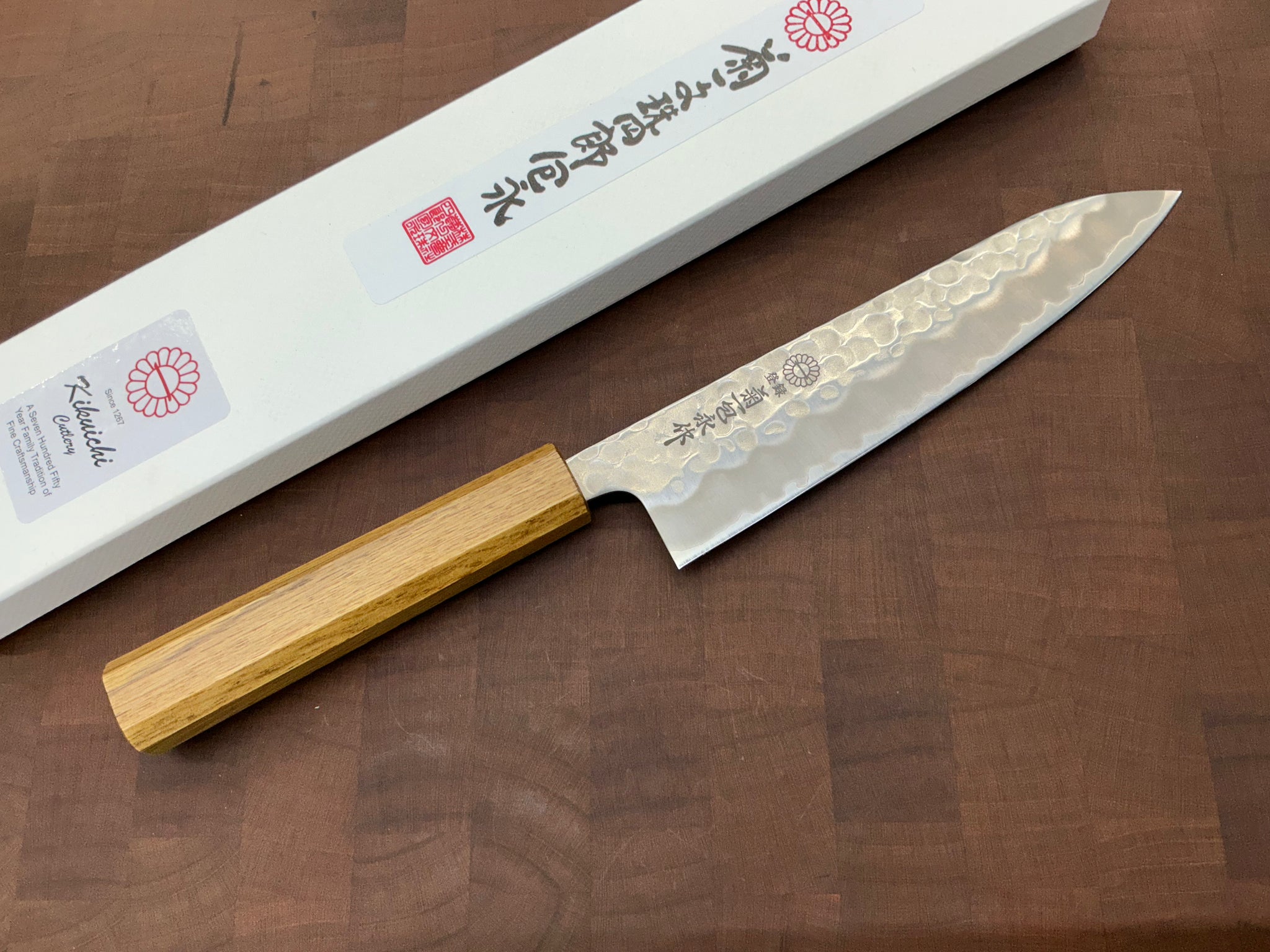 18cm Gyuto for all your prep, this knife is dying to cut onions and dice veggies all day long. With a hammered Tsuchime finish on the 3 layer blade, this Carbon beauty will get more and more character with each slice and each wash.  The patina will come out and you'll love the way it looks with the sleek oak handle.