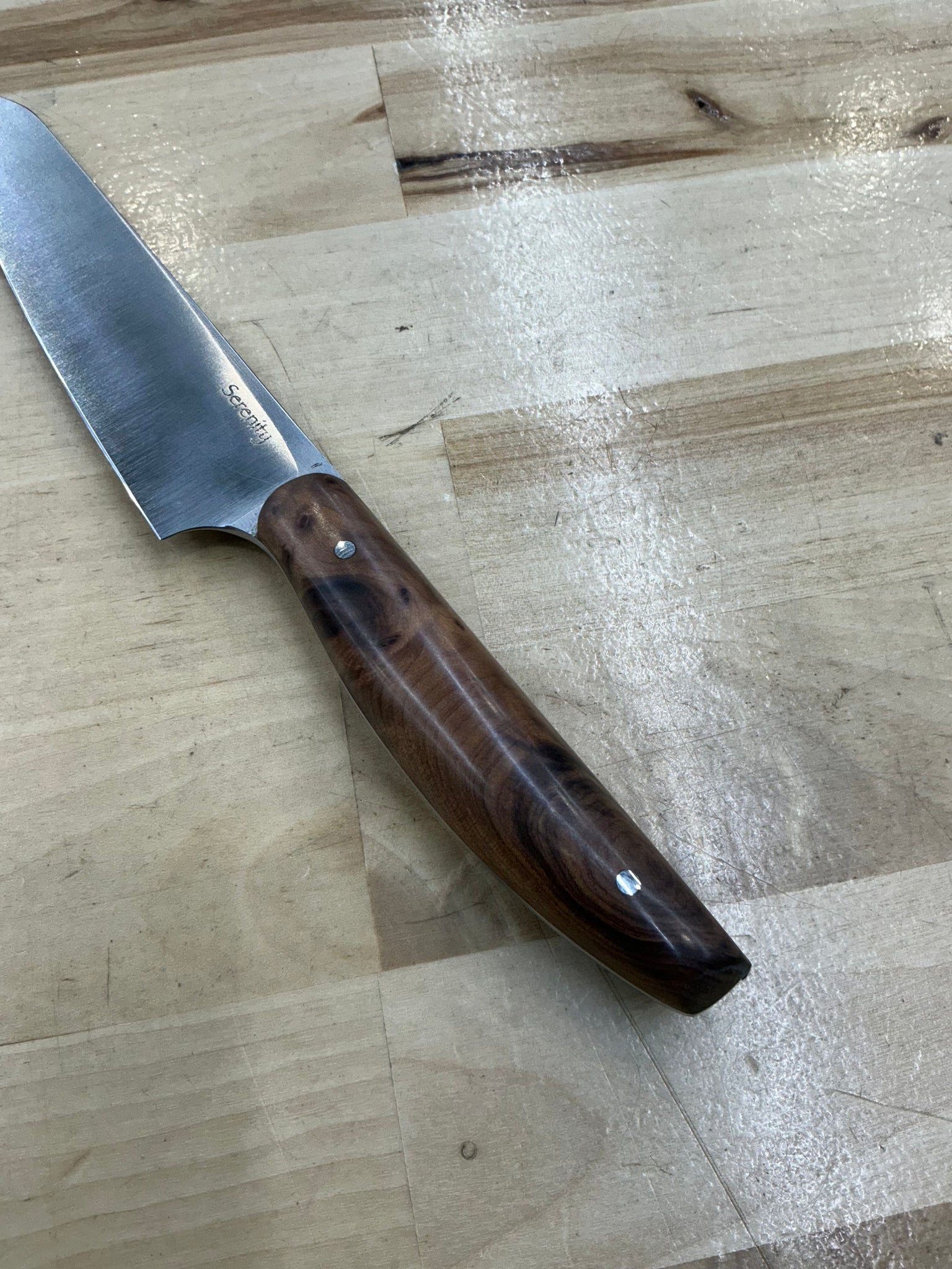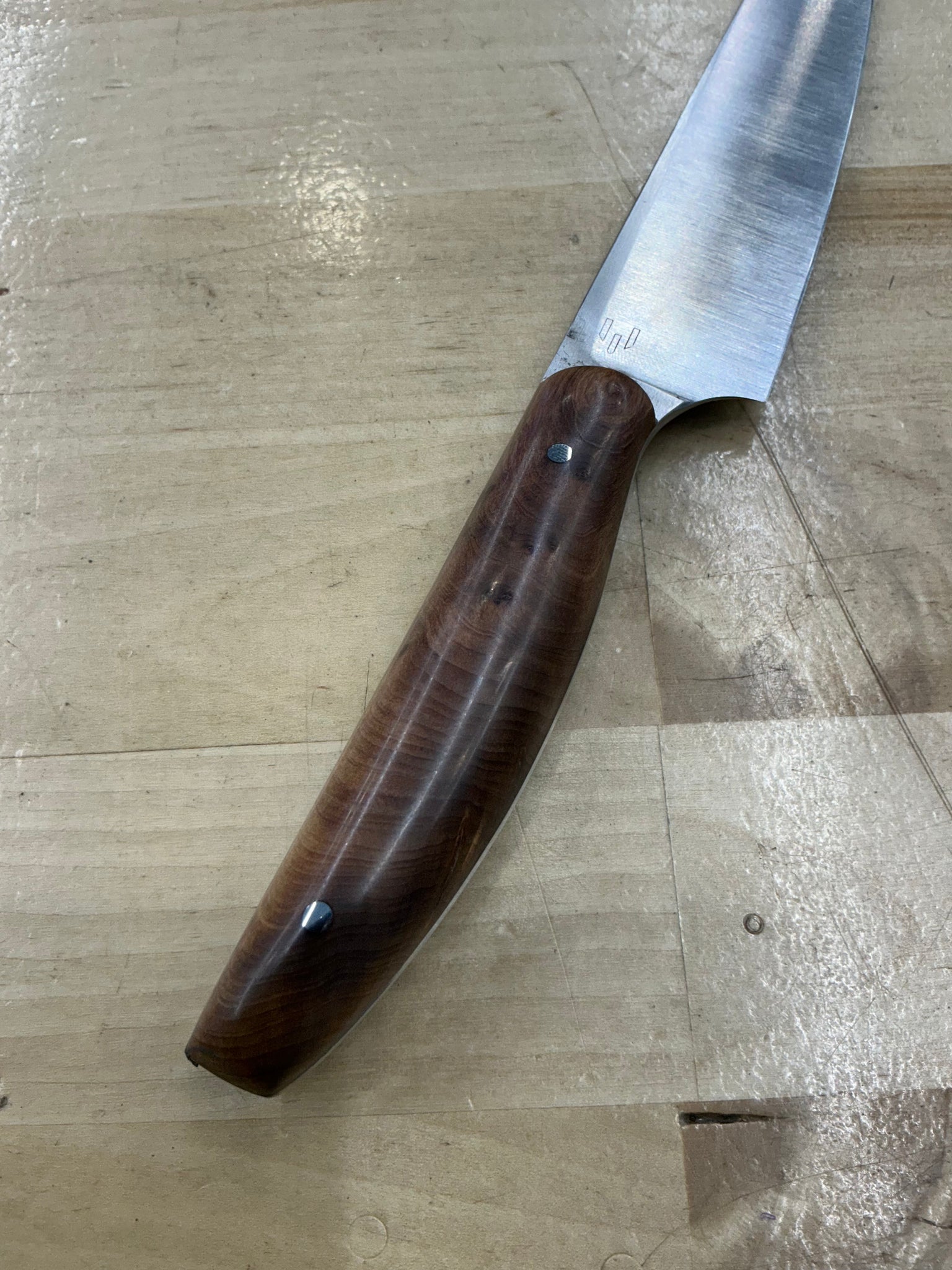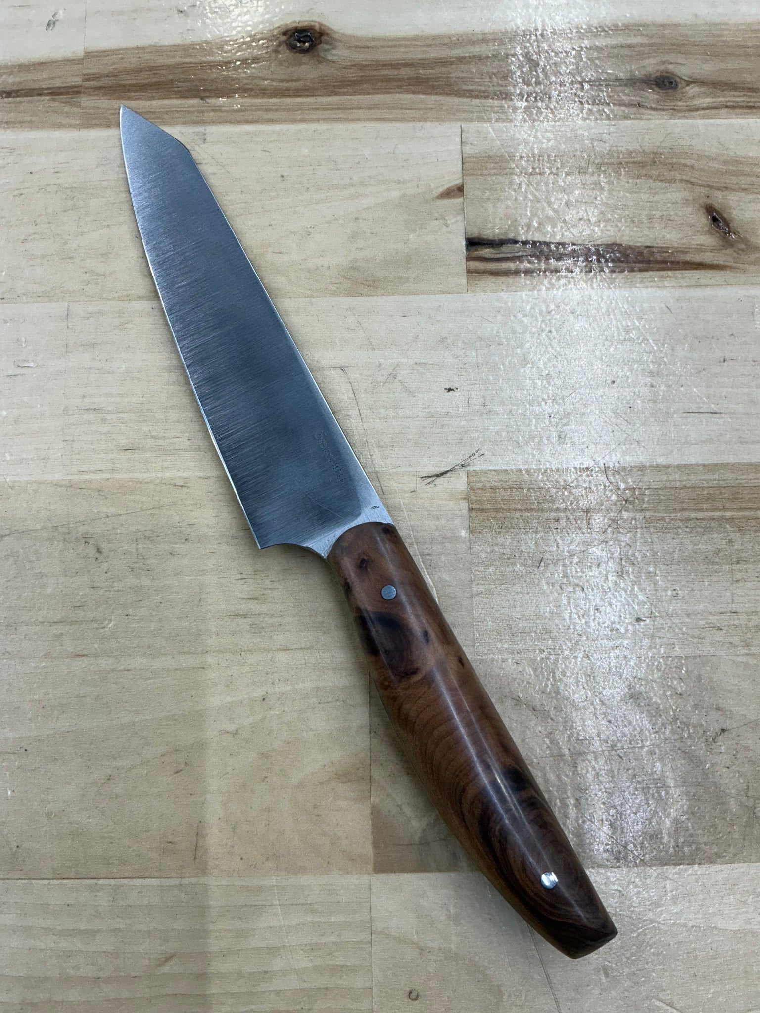 The quick go-to knife in the kitchen for small & quick tasks.  The K-Tip Petty is designed for anything either in the hand or smaller sized tasks such slicing your steak to cutting up limes for the Rita’s.  This knife features CPM Magnacut stainless steel with a beautiful stabilized Cedar wood handle secured with two eight inch nickel silver pins.