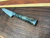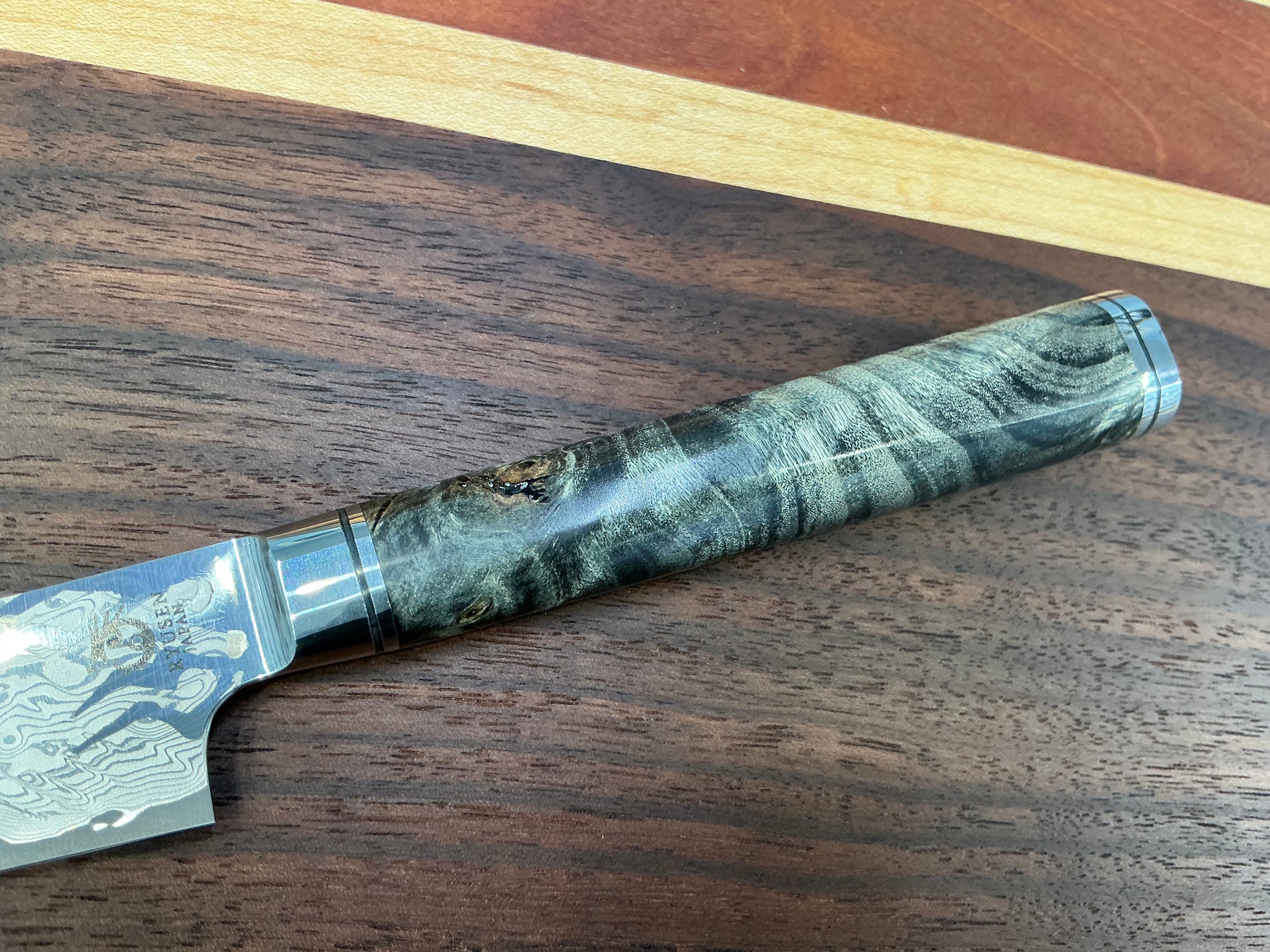 Le manche est en bois stabilisé qui utilise du « peuplier », qui présente un beau grain chiné et des boutons. Le bois stabilisé est un matériau stable qui résiste à l'eau et aux changements de température en infiltrant de la résine dans le bois et en le durcissant. Un manche avec une présence qui fait ressortir la plus belle lame.