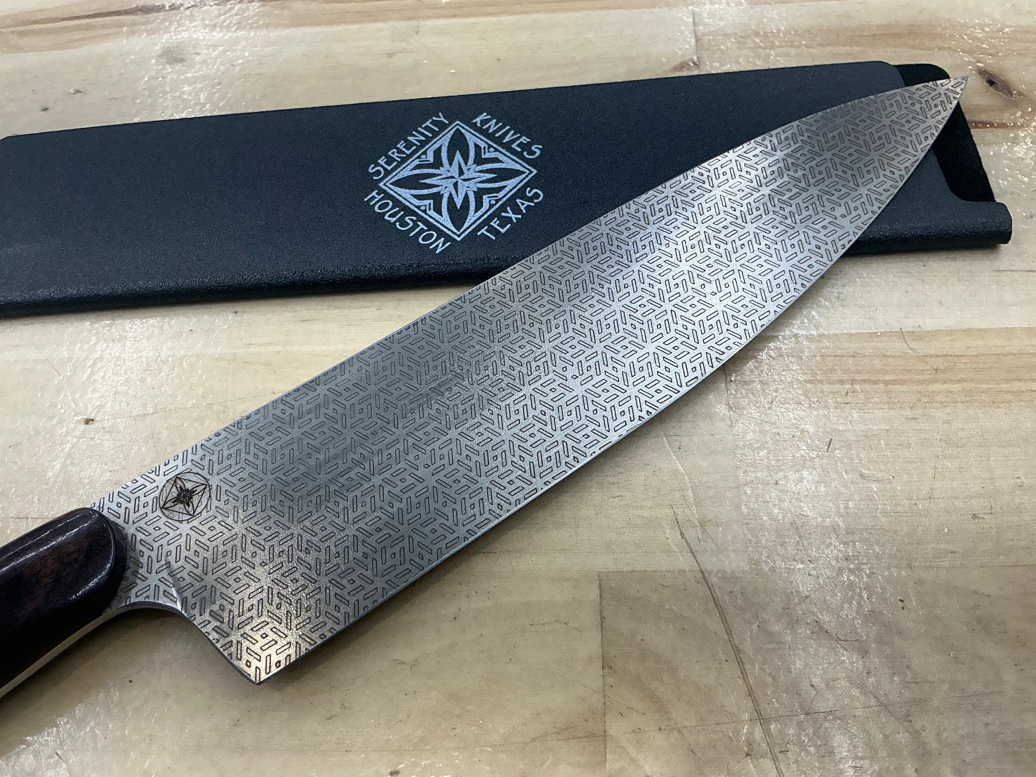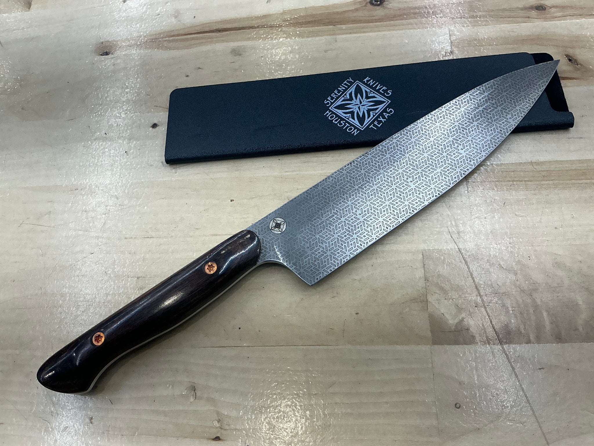 Unleash your boldness with the Walnut Gyuto! CPM154 steel boasts a full flat design and satin finish under a Star Lasered engraving, perfect for tackling any challenge. The Walnut Liberty Wood Handle adds a touch of adventure to this unique knife. Take on any task with confidence!